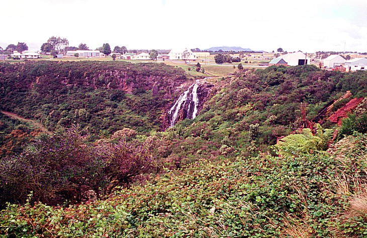 We then came back into the town and found a little ‘do it all’ type, do everything supermarket, and bought a few things for lunch. We posted some postcards at the post office which wasn't open today, so I couldn't get the stamps I wanted. We then had coffee and bun in a coffee shop, if you can call it that, with a very silent man who served us, and then went in search of petrol. We finally left at 11.30 and out on a trek up through the 99 bends through the barren hills. We stopped at the Nelson River and walked through the rainforest track for about half a mile to the spectacular Nelson Falls just peeping through the trees, with a clear blue sky, but it was still chilly. The air was very cold walking through because obviously we were out of the sun. the information boards said to think of one step being half a million years in time - quite mind boggling to think of, but it was a very unexpected delight walking through here.