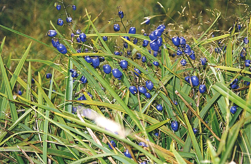 The weather was very variable, and the wind was blowing and it was pretty cold. It came on to rain while we were there so we sat in the car, made up cheese sandwiches, had a chocolate shortcake from the other day, half a nashy each and some lemon drink we'd bought, by which time the sun was shining again. We passed a dead kangaroo or wallaby on the road. Adrian spoke to a 70 year old lady of a couple from Queensland who were touring Tasmania for a week. She said that Queensland had been upper 30'sC all summer with 90% humidity, so she was sort of enjoying the cool here. We stopped at Tullah to both have a little snooze. This town, like so many on the western side of Tasmania, found their wealth in the past century with various types of mining. Now it's just a tiny town with glorious rather Canadian looking scenery with lots of trees and mountains. We passed through Rosebery to Renison Bell where we stopped at the site of an old mining area. There was an historic walk here, we looked at it, but we didn't go on it and then we continued through Zeehan towards Strahan. We stopped at one point and took a long unsurfaced track down towards the west coast, which is practically inaccessible by road. When we finally got to the end it was just a huge sand dune in front of us, very high and very steep sided. We started climbing up this and I soon gave up but Adrian carried on to the top. There was also a long bit which looked like an old railway track. There were some blue flowers, the seeds of the flowers looking rather like bluebells but these were hanging.