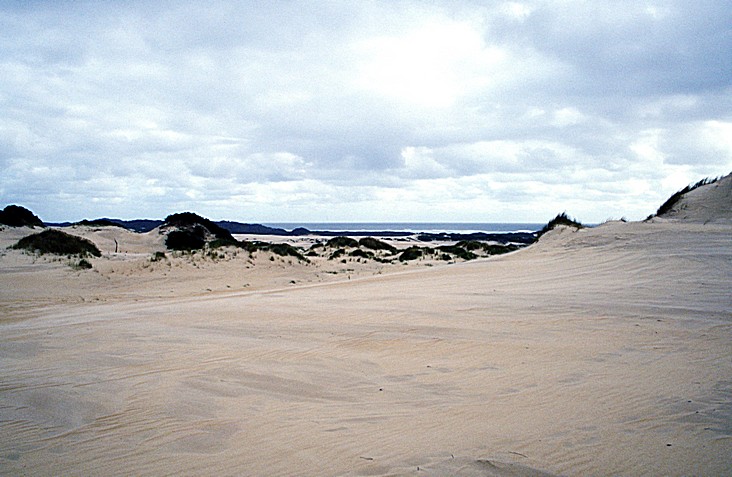 We made our way back to the road and continued to Strahan. Just as we got to Strahan we took a road going to the West Coast, and this a road was supposed to go on and we did reach a parking place at the end. We climbed up on a boardwalk, - the dunes here were nesting grounds for shearwater and penguins - and we viewed this magnificent wild beach. We then walked down onto the beach briefly, it was extremely windy, but very magical and wild.