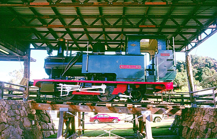 We returned to the bottom and to the car and by now it had gone 10 o'clock. We dove into the town of Queenstown and stopped first by the little engine that they hope will be running soon and lots of historical bits around to look at. We then drove on through the town to the bit where they're hoping to restore the railway.