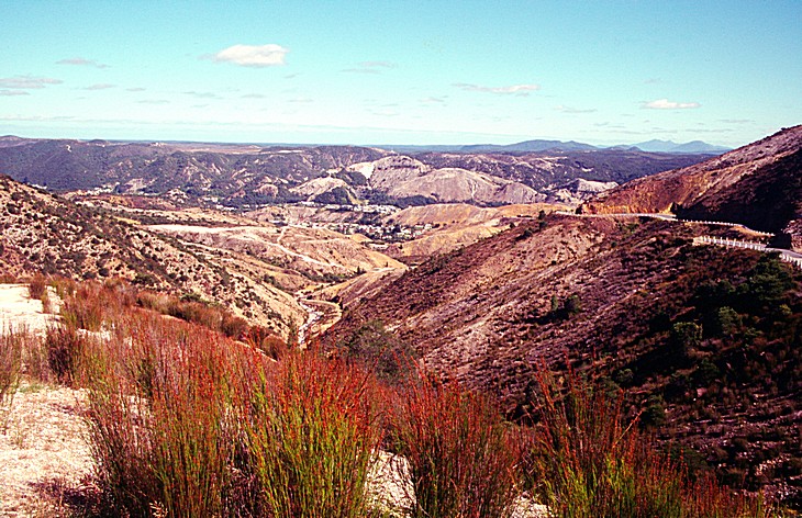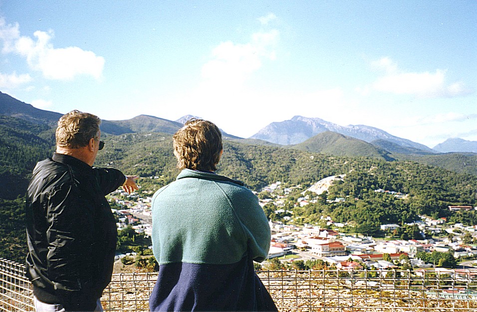 Saturday, 7th March 223 km in hire car We awoke to see the sun just about to rise above the mountains opposite to give a clear blue sky. It felt warm in our room but was quite chilly outside. We had a cup of tea and then our breakfast in our room and left at 9.15. We started our day by going up on the chairlift which was next to the hotel. We were the first customers of the day and had to wait for the chap to go up in the chairlift before us to let us off at the top. He was someone who liked to chat and told us a lot of interesting things about this area and its mining days. Apparently the volcanic rock of this West Coast of Tasmania contains all sorts of different minerals and mines would be for one particular one, but then they would find all sorts of others. This area was particularly copper and he said about the barren hills which are being reforested around about and there are a lot of trees on some the hills but he said this was only in recent years that these had grown. The sulphur in the atmosphere had made the soil very acid from the smelting and it was taking a long time for the sulphur to be leached out of the soil so that trees grew in it. The greenies came at one point and planted 1000s of trees which all died as the soil isn't yet ready for it. But hopefully in time it will be. The contrast between the barren hills and the hills with the trees was very great. He told us many many facts about the surrounding area and I think he liked to have the customers to talk to. They are hoping to get a little railway, like the Ffestiniog one, going in this valley for the year 2000. It was pretty chilly up the top, but a bright day.