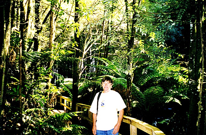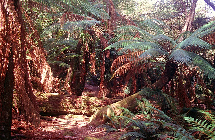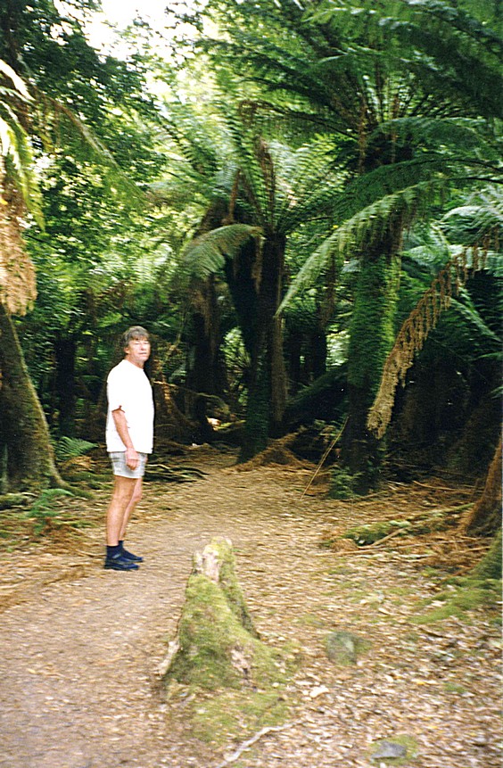 We stopped just up the coast at Beaumaris and walked through the coastal reserve to the beautiful wild beach and the rough waves of the sea. It was nearly 9.30 and very warm. We stopped at St. Helens on a large harbour of inland water and went into a 'Festival' supermarket and bought a few things for lunch, not very inspiring, and then continued inland. We took a road off to Gould's Country, supposed to be a township of old wooden houses - three kilometres. The houses seemed to be scattered over a vast area, so we didn't get a feeling of a township at all, just one or two houses and a church. The road had become unsurfaced and we thought carried on through to rejoin the highway in a few miles. We went a long distance along this unsurfaced road through splendid country of wonderful trees and greenery and just like going through someone's country estate. We came to a sort of junction and the way we thought we wanted to go, said no through road and as our map doesn't show any places much off the main road, we had no way of knowing exactly where we were, and reluctantly we had to turn around and retrace our steps to Gould's Country. The scenery was just splendid with the sun shining and apart from the rough surface, it wasn't too much of a hardship. While near here we saw two large parrot sized birds with mauvie blue bodies and the yellow underwings. Back on the main road we stopped just outside Pyengana at a roadhouse, a place that did petrol and apparently meals and arts and crafts and all sorts of things and a shop. We had a tea and coffee but it didn't seem to have any cakes which seemed a little incongruous, and they seemed a strangely dour couple. We sat outside with our tea and coffee, the wind had got up and the chap said he'd lost all his sun umbrellas, due to the wind. The wind gets up unexpectedly and strongly. We found the place mildly amusing, but enjoyed our drink and the view and then continued on our way. We went over the Weldborough Pass and at this point the road came back in from the right and it was the road which would have gone through after Gould's Country. We'd come to a sign saying that the road was closed due to bridge not being there ('Bridge Out'), and the sign on this end said the same thing so we were in the right place, but we couldn't have got through because of this lack of a bridge. We stopped just afterwards at a rainforest, where there was a simple 15 minute walk through myrtle trees with information boards telling the story as if by Grandmother Myrtle.