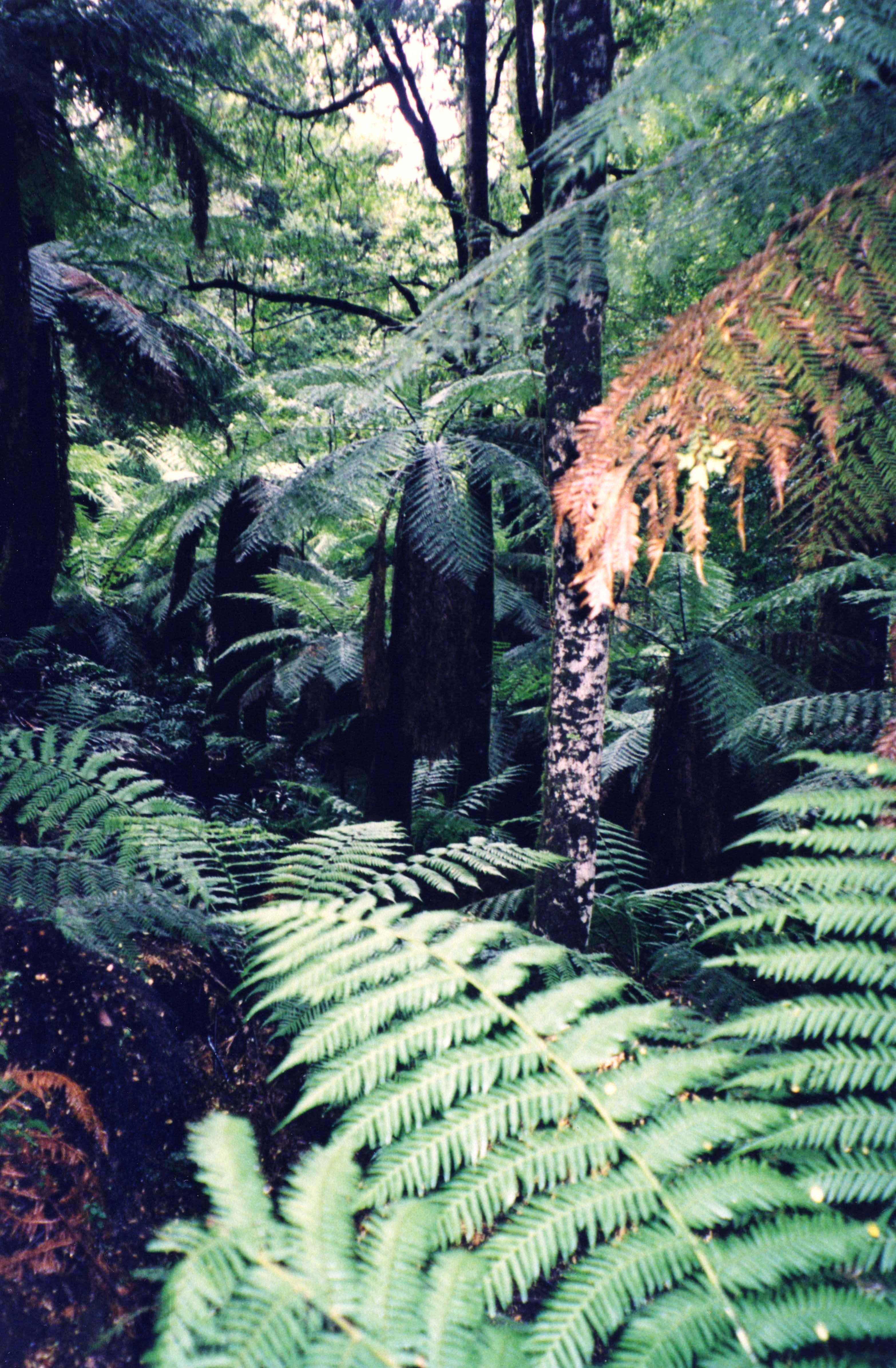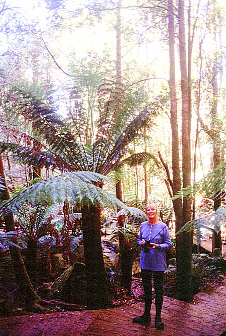 Thursday 12th March 140 km in hire car Another beautiful day and we woke up later by the radio coming on and music playing. We got ourselves organised to leave, for our flight back this afternoon and left at 9.40. We had a bit of trouble getting out of Launceston because Patterson Road didn't lead to Patterson Bridge as we had imagined it might. But we soon found our way north on the Tamar Highway, and then turned off to Notley Gorge mainly because we'd had a glass of Notley Hill wine earlier in the week and said, “Oh, let's go back that way”. In fact, this gorge was called Notley Fern Gorge, and there was an hour long walk down to the gorge and back up. The rain forest there was the most primeval feeling rainforest we'd been in, huge fern trees and dark and apart from those other dank and huge trees. We had bird song, and we had for company some small kangaroos or wallabies, that we heard rather than saw them because they leapt away when they knew we were approaching.