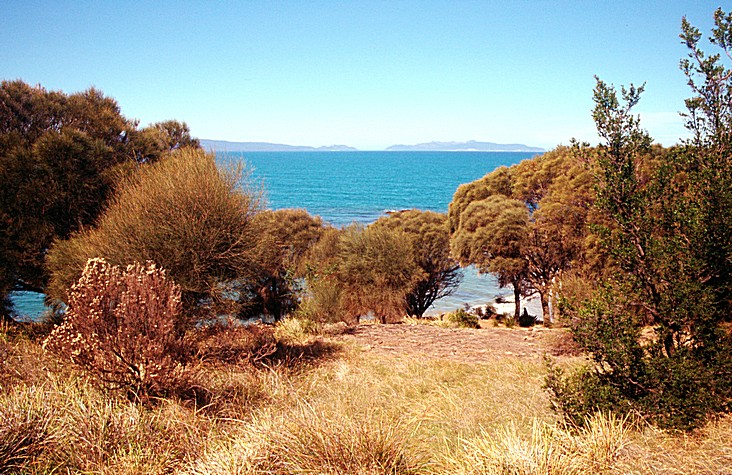 It was beautiful scenery, quite blowy, very variable looking weather but warm in the car. It looks as though it could rain, it does every now and again but also sunny, very very pleasant. The man in the tourist information had said to us how laid back it was here - that's laid back compared to Australia! and he gave us a little silver spoon from Wynyard. Initial impressions of Tasmania is it is very pretty, very English. Lots and lots of pretty flowers. Beautiful, beautiful coastline, beautiful white beaches, turquoisey sea, red soil, and mostly lack of traffic. We'd taken a little windy road rather like an English road along with Devon coast and first impressions are very favourable, crops growing in the fields, funny sandy coloured sheep and very favourable so far. We drove along almost until Stanley, where we stopped by a lovely little beach near a place called Cowrie Point and looked across to where Stanley must be, and a huge rock called 'the nut' sticking out and then decided to return. We had to return the way we'd come along this very pretty coast road. We'd seen a lot of logging lorries coming loaded with wood, and Adrian was really enjoying driving a car with power. We arrived at Ulverstone, our night stop for tonight. We drove around a bit before we asked a lady who knew where the road was and where the motel was. We had room number one and we settled ourselves in, in this comparative luxury, having stayed in a workshop garage the previous night. When we were ready, we went across to eat in the restaurant which was all of 20 feet or so opposite. We had an enjoyable meal, I had Trevella fish and chips. Adrian had a T bone steak and we had a half carafe of wine, and then went back to our room. We thought we would have a wonderful night's sleep after last night, but in fact didn't sleep that well, the wind was blowing quite a lot.