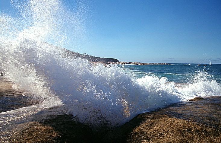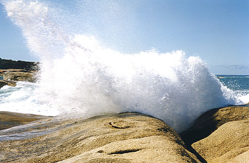 and then we stopped again beside a beach [probably Kelvedon Beach], with a view almost too beautiful to describe. The deep green of the trees, the white of the beach, deep turquoise sea, the white waves and the misty, deep blue Islands in the distance of Schouten Island, Freycinet National Park, and then the pure blue sky beyond. We climbed down to the beach and just enjoyed this wonderful view. We continued through Swansea and then left the sea and drove inland for some kilometres and reached the sea again at Bicheno, which was going to be one of our overnight stops originally. We went down to a blow hole where water was splashing up through the rocks, very attractive and fun.