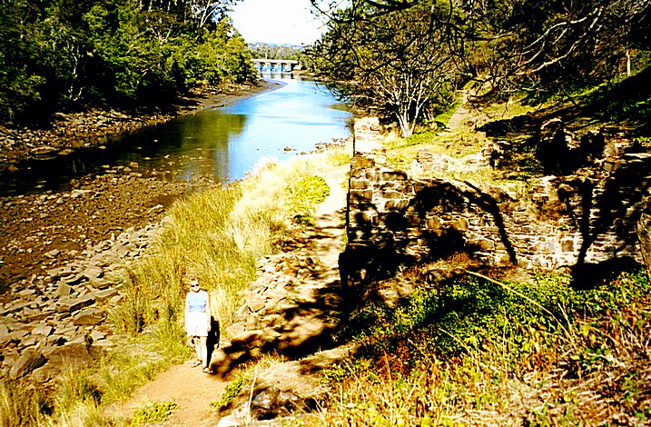 We continued to Georgetown and stopped at the information centre, then drove on into the town, parked beside the water and went for our little walking tour of Georgetown where we saw a monument to the early settlers. This was supposed to be Australia's oldest town but it didn't have much evidence of the old town. We drove a bit further along the road to the end at the headland, where the Tamar River comes out. We watched the Seacat leave. There is a little beach here where the little penguins are supposed to come like the ones that we went to on Philip Island. We had our lunch sitting here and walked on the beach, which was actually a very coarse sand and hurt my feet. The sky was a beautiful blue, blue sea, green grass and green trees - all very pretty and tranquil. We drove up to the lighthouse and viewed along the north coast to the east and could see lots of sandy beaches. We drove down to one of these, a long sandy beach speckled with pebbles and we had a paddle in the sea -the water was very cold but the sun was very hot. We sat on the sand for a short time. We drove up the hill to St. George's lookout above Georgetown, which gave a good view out over the Tamar Estuary, where we spoke for a long time to a couple from near Adelaide, with their small motor home. We crossed the Tamar River on a fine bridge and stopped soon afterwards opposite Marion's Vinyard and walked down a long jetty out into the river, but we were unable to view the bridge from here. Soon after, we walked down beside a little creek for about a quarter of a mile, to the ruins of an old flour mill. Very pleasant in this late afternoon temperature.