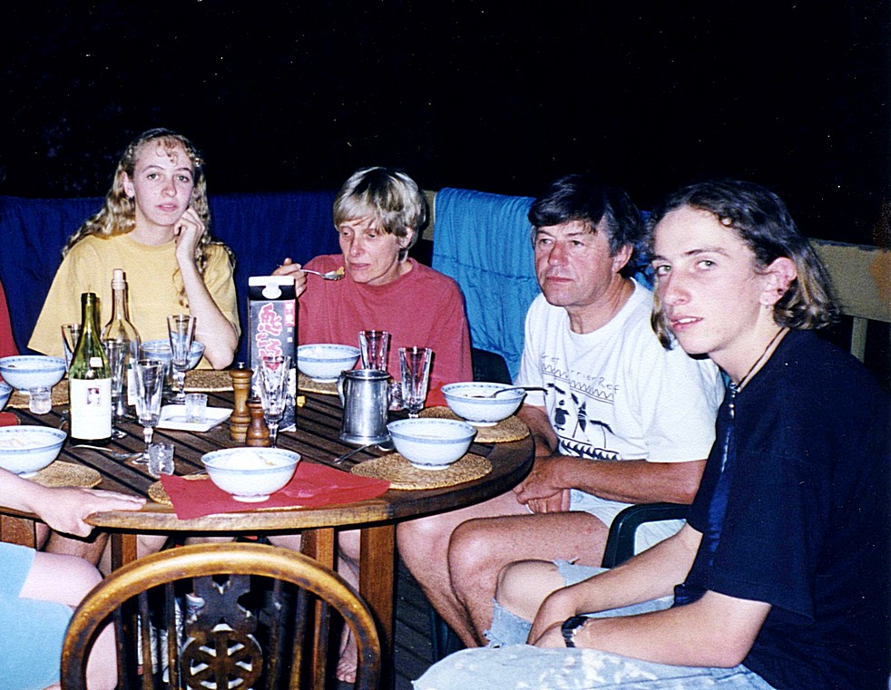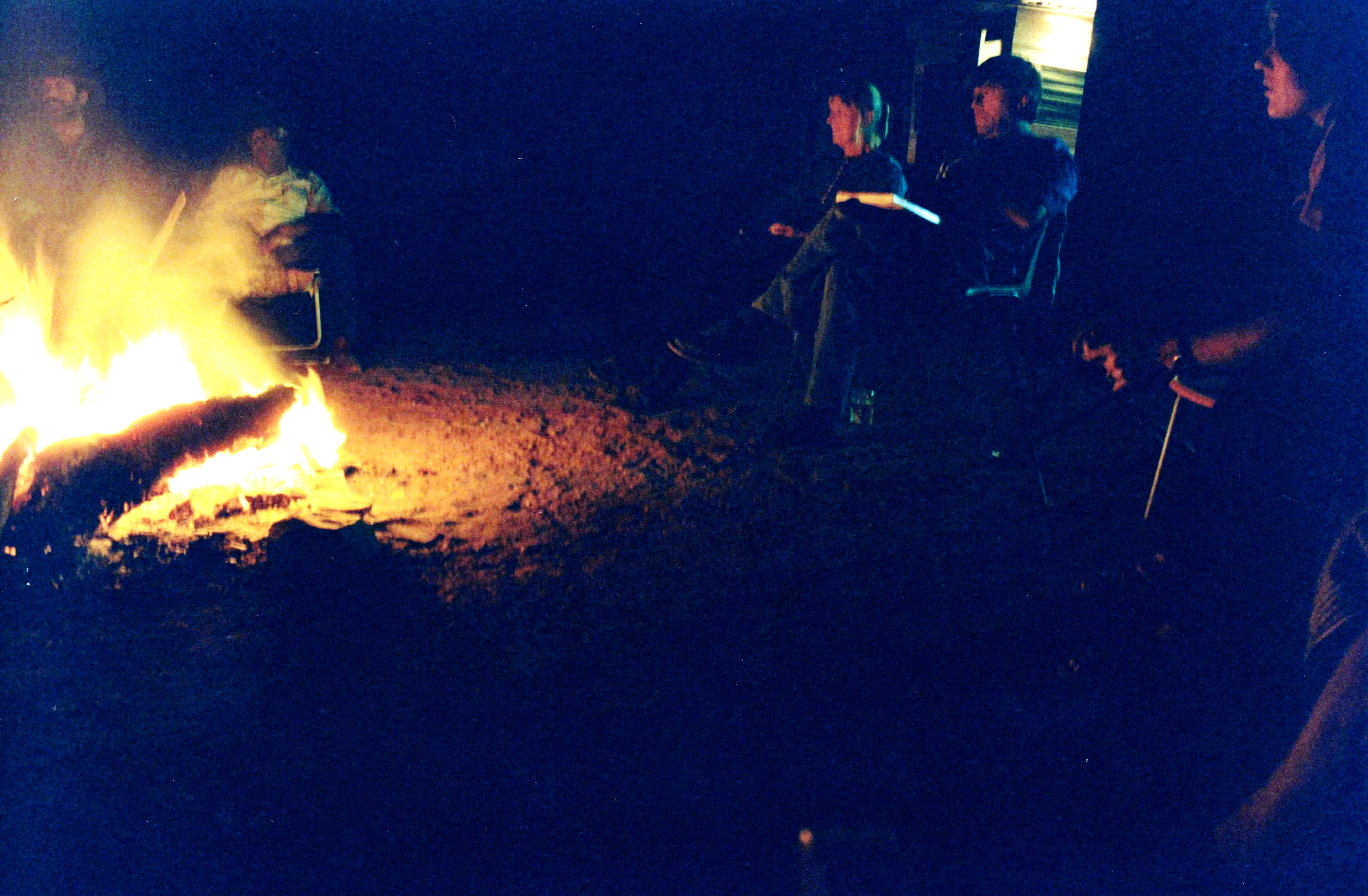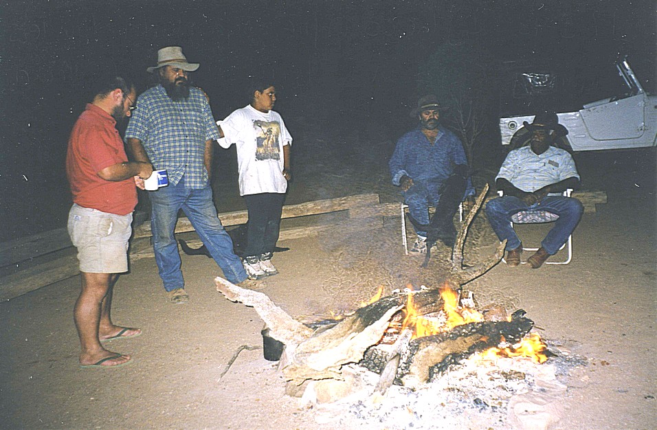 Murray, Cliff & son, Terry, Ron (Coulthard) by the campfire at Iga Warta