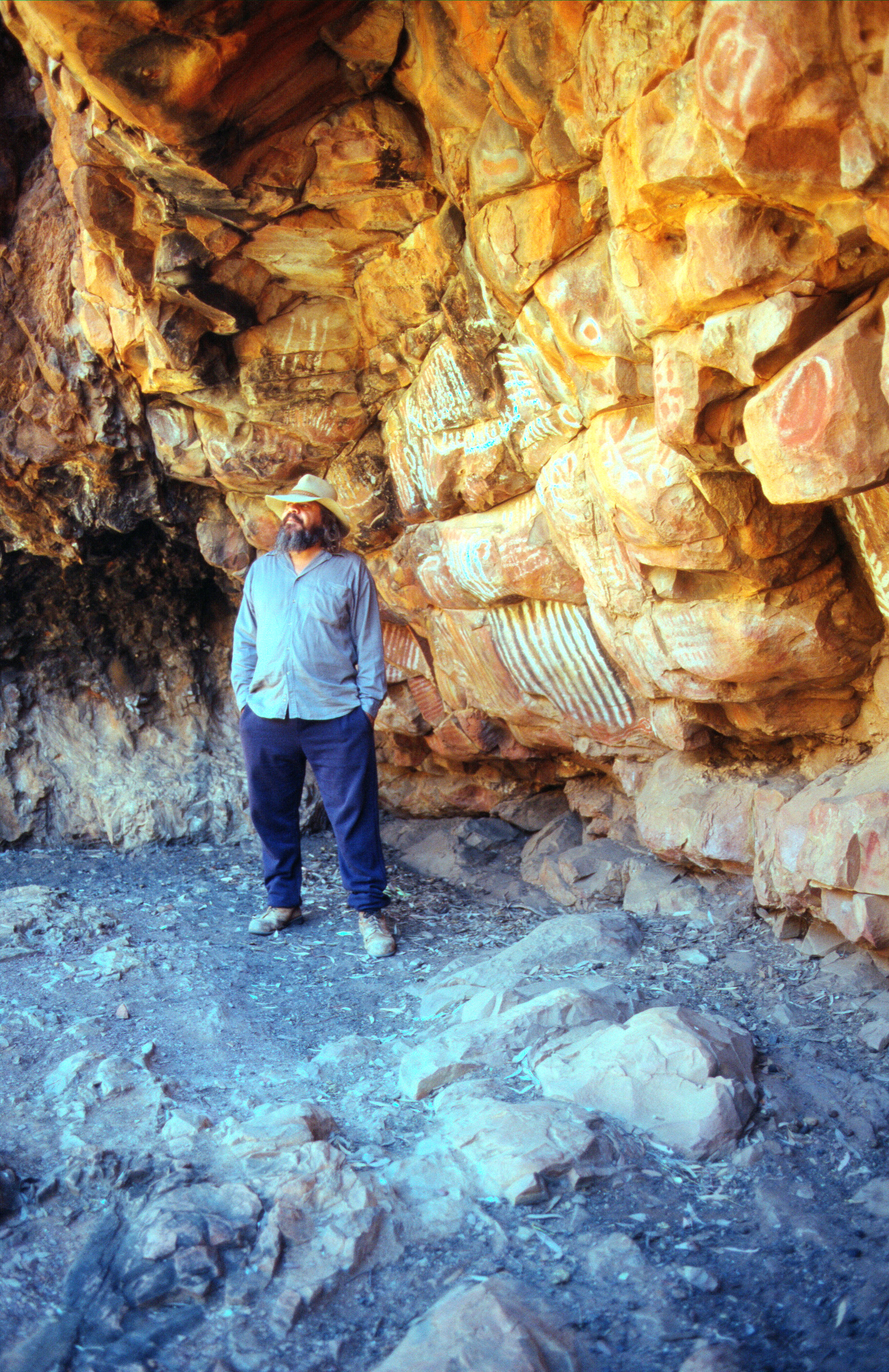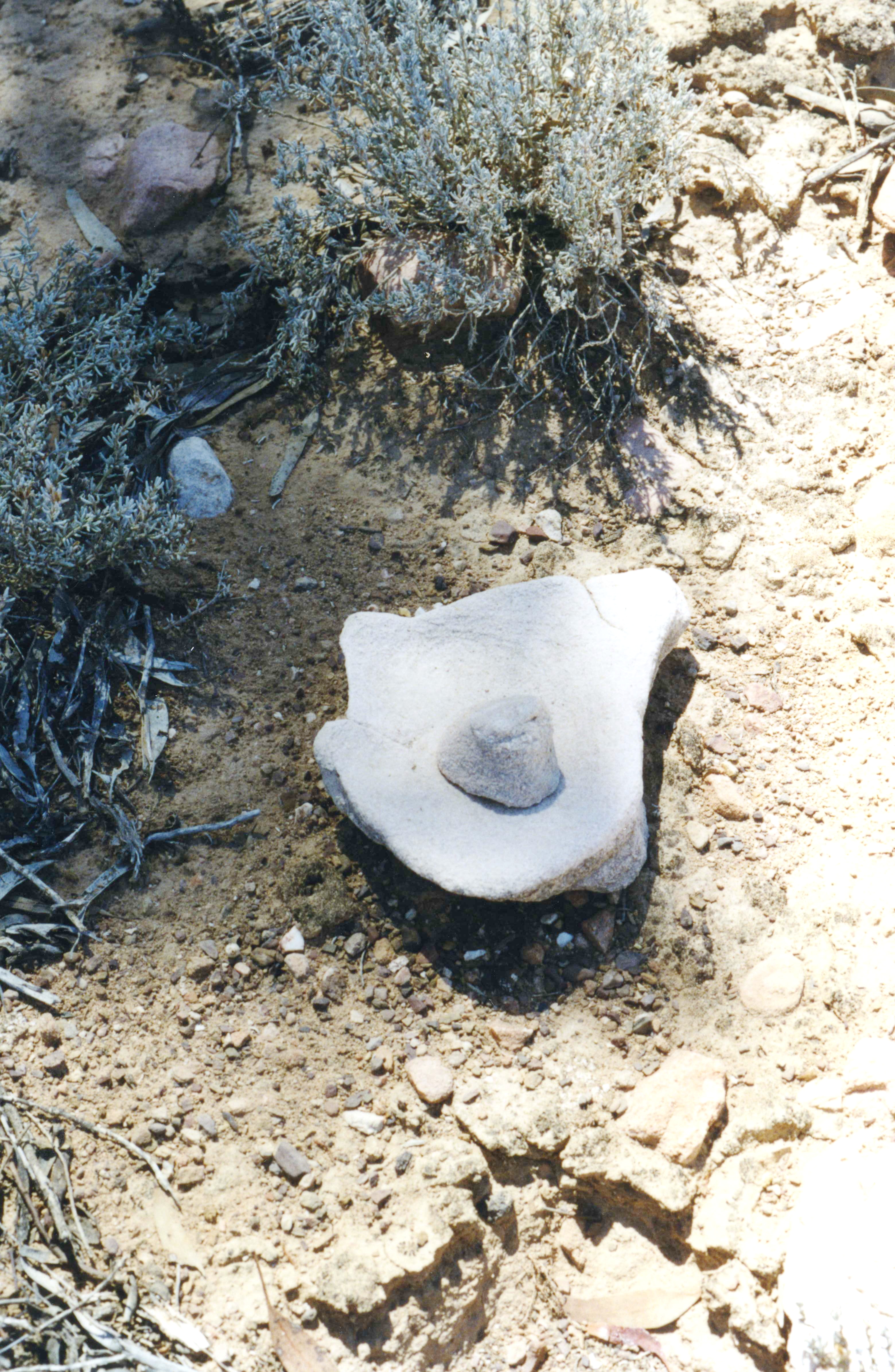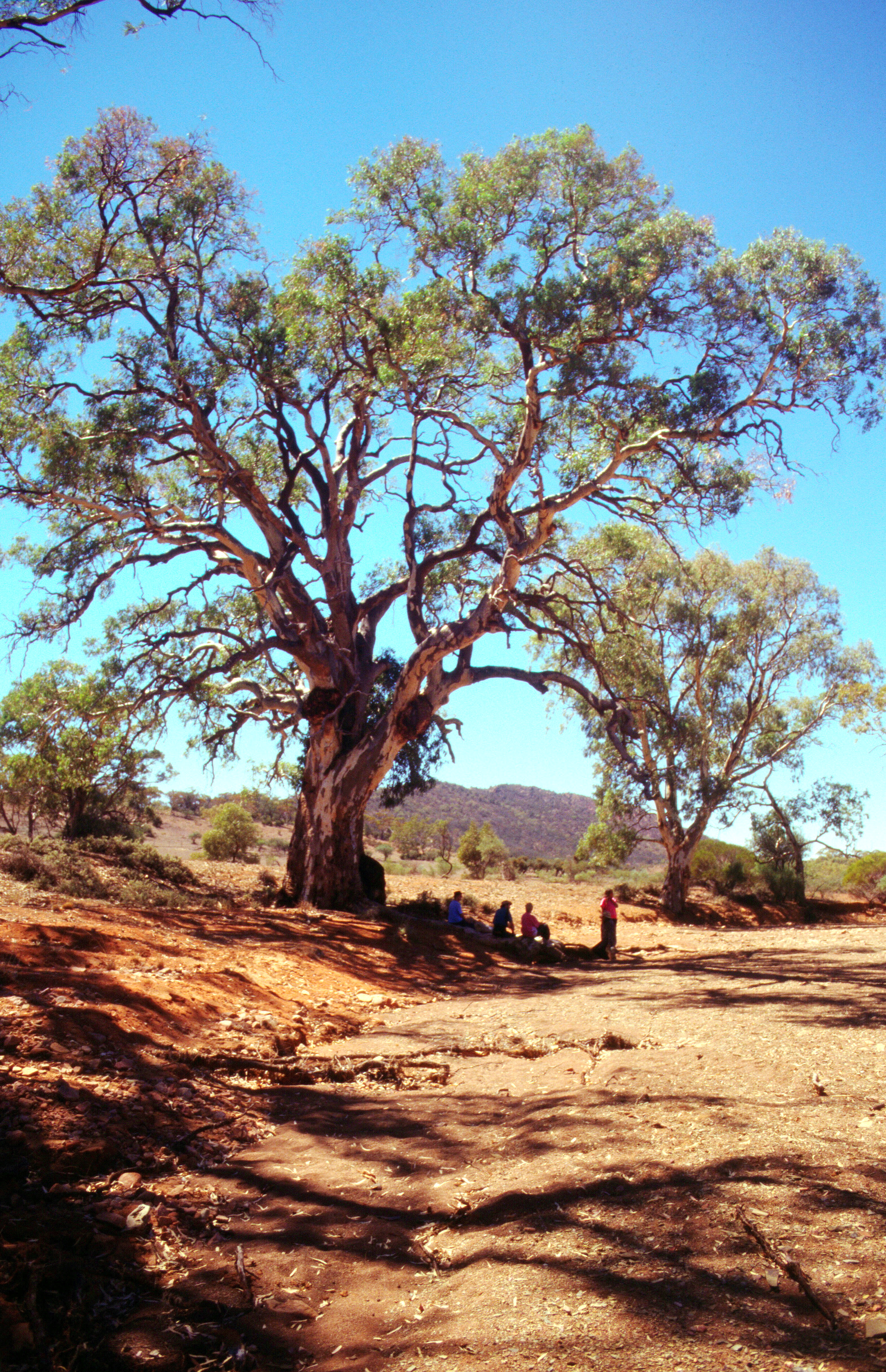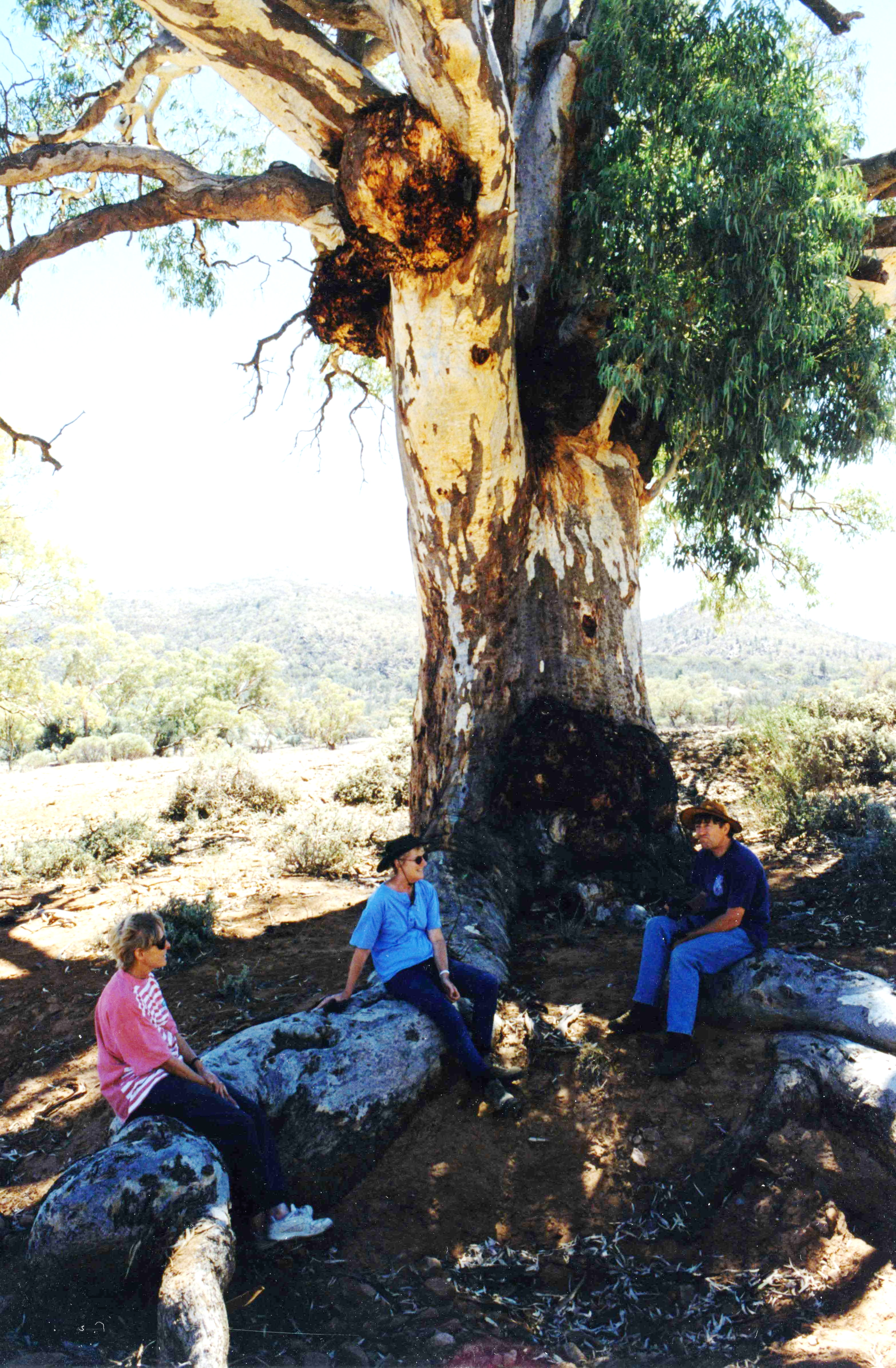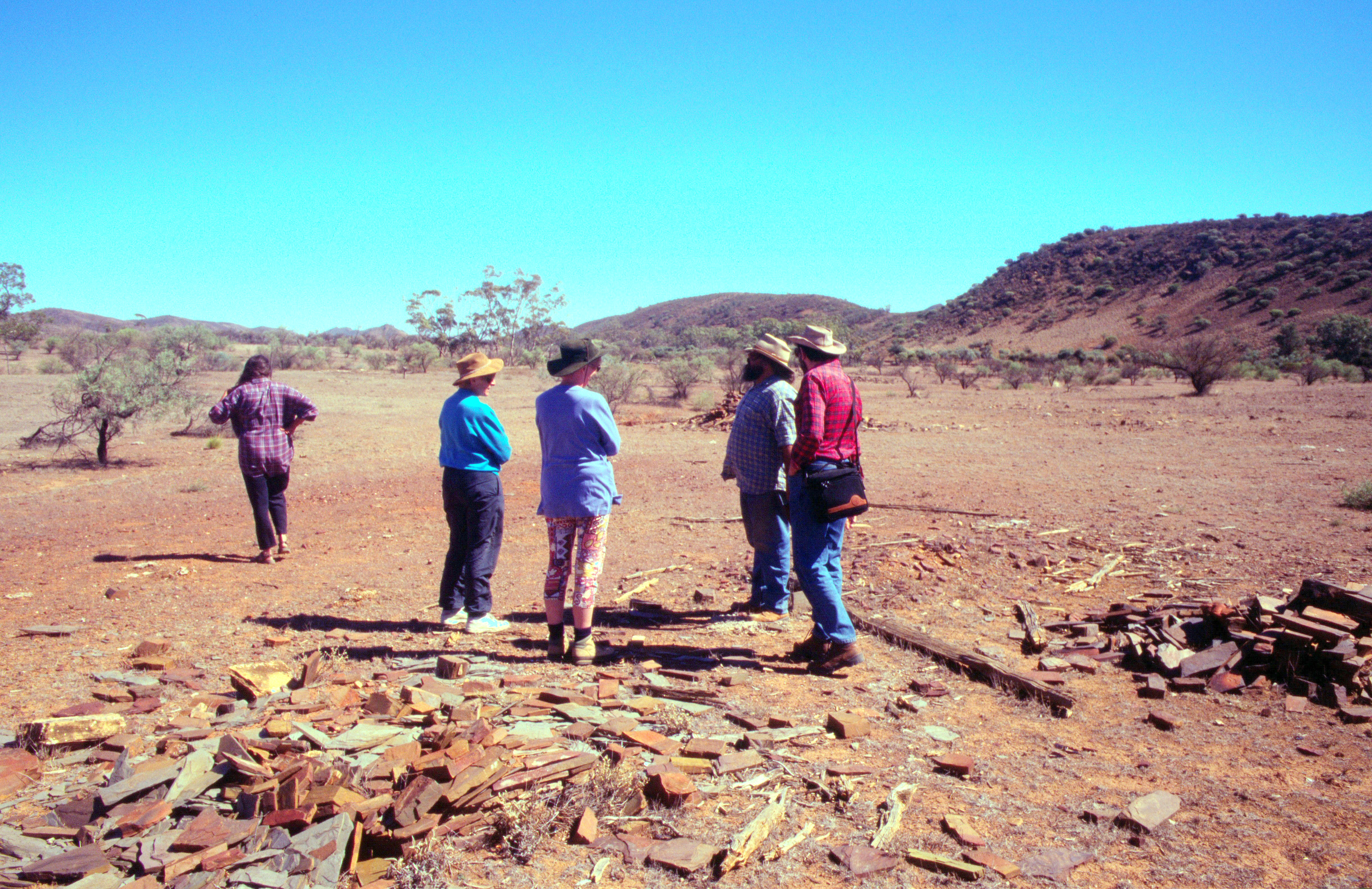 Tuesday 17th March The night was not cold and a hot day followed with clear blue skies. After breakfast by the log fire, we went out in the landrover with Jan & Rob and the others. Cliff (part owner of camp site) and his wife Genevieve took us to some old aboriginal sites where they showed us various artifacts and paintings. It was a lovely morning. We went back for lunch, and in the afternoon we went out with Rob & Jan and we first found a waterhole where there was a only little bit of water and then we drove off into the Gammon Ranges and could see in the distance the dried up Lake Frome. We arrived back some time after 6 o'clock, rather hot and dusty and had a shower.