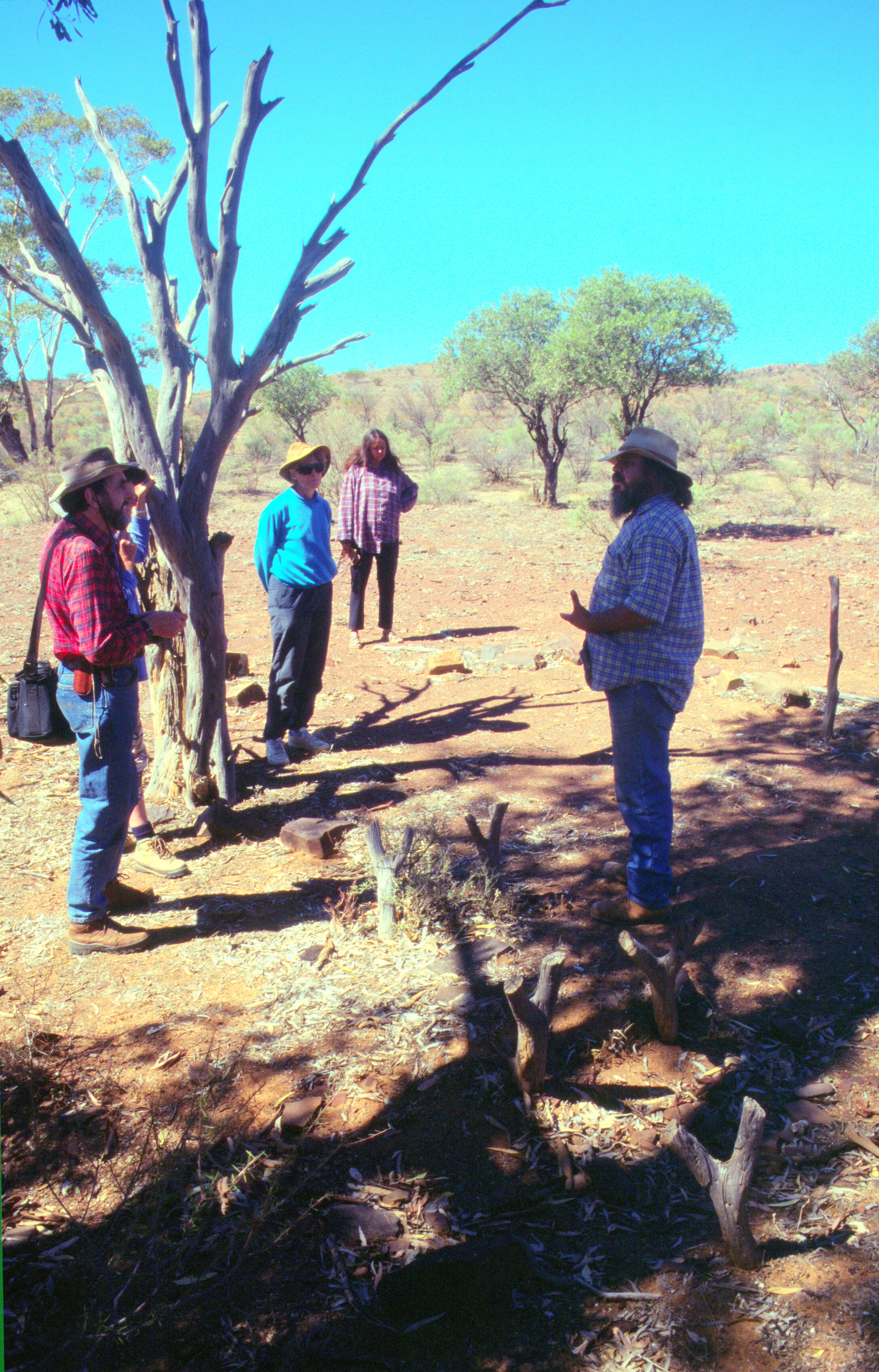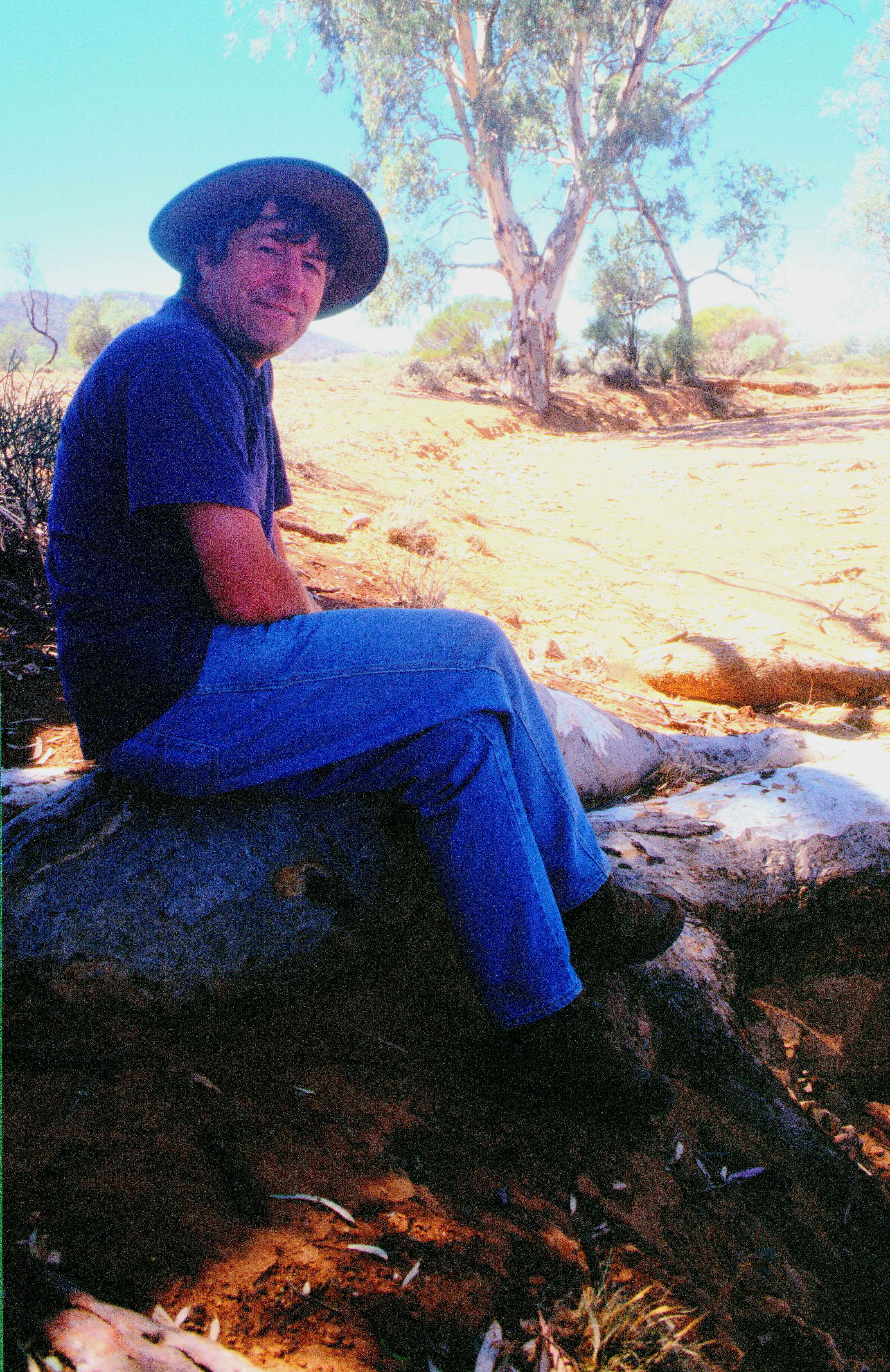 We had a good night. It was a bit chilly when we woke up and had been windy in the night and was windy quite a bit in the morning but a clear blue sky and a beautiful day. We had breakfast, we made toast on the embers of last nights fire and then Cliff came with Genevieve and we went across to Terry's house where we saw a wonderful display of photographs, mounted with captions, all about their Aboriginal tribe. We then went off following them and they took us to a gorge. We looked first at some little implements that we picked up which looked just like stones but they were past implements of this Aboriginal tribe.