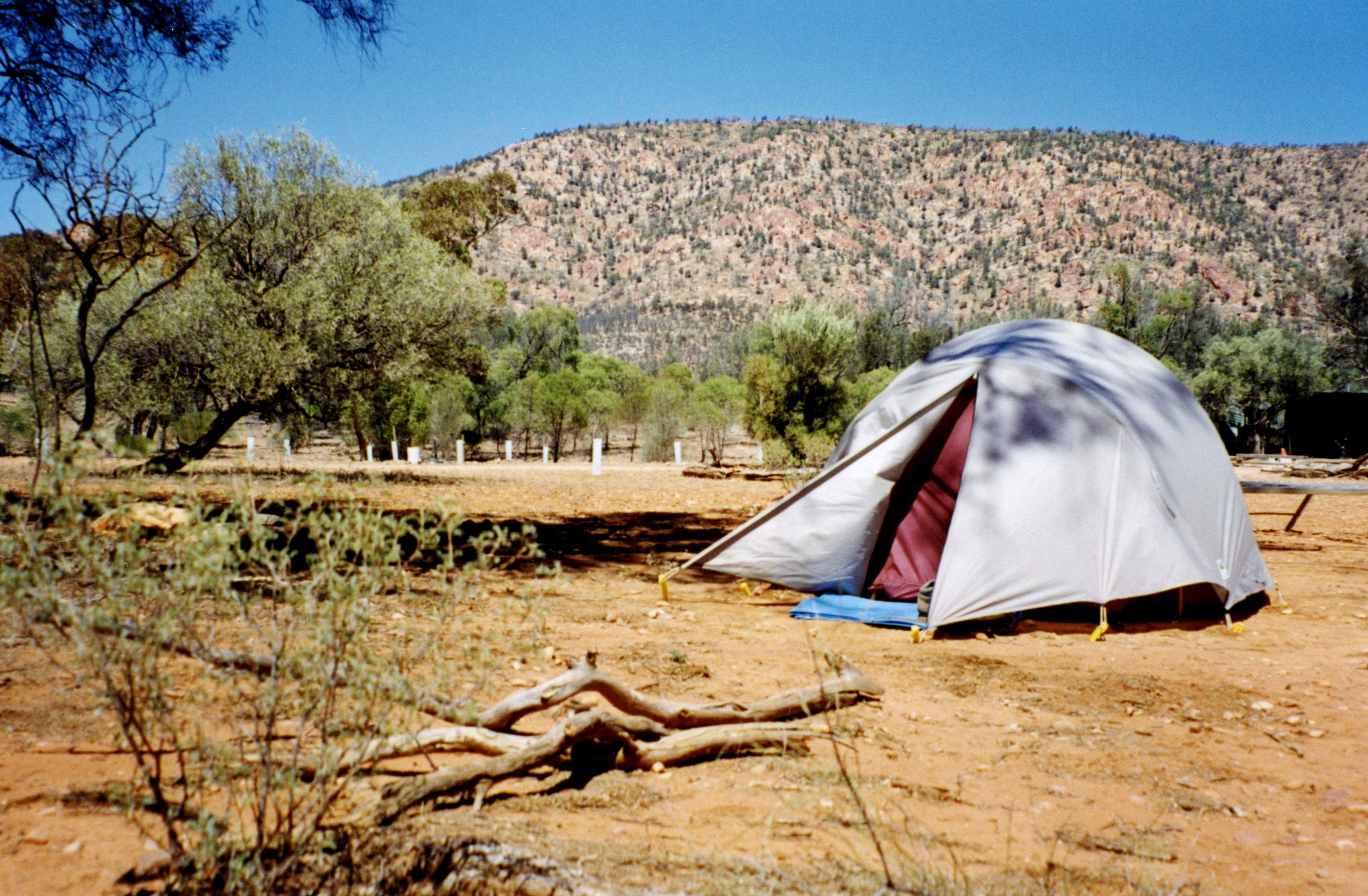 Monday 16th March A chilly morning, that turned hot later. This was the day that we were driving up to the Flinders with Jan & Rob, so we got up quite early, got ourselves organised, and left soon after 9.00. We stopped at Clare and had coffee. We stopped later at Oloroo, and had lunch in a roadhouse and then once more at Hawker for petrol and arrived at the site just before the sun was going down. The site is called Iga Warta - 'The home of the native orange'. We got the tents pitched and then we sat around by a big log fire under the stars and the almost full moon and then had supper and retired to our little tent.