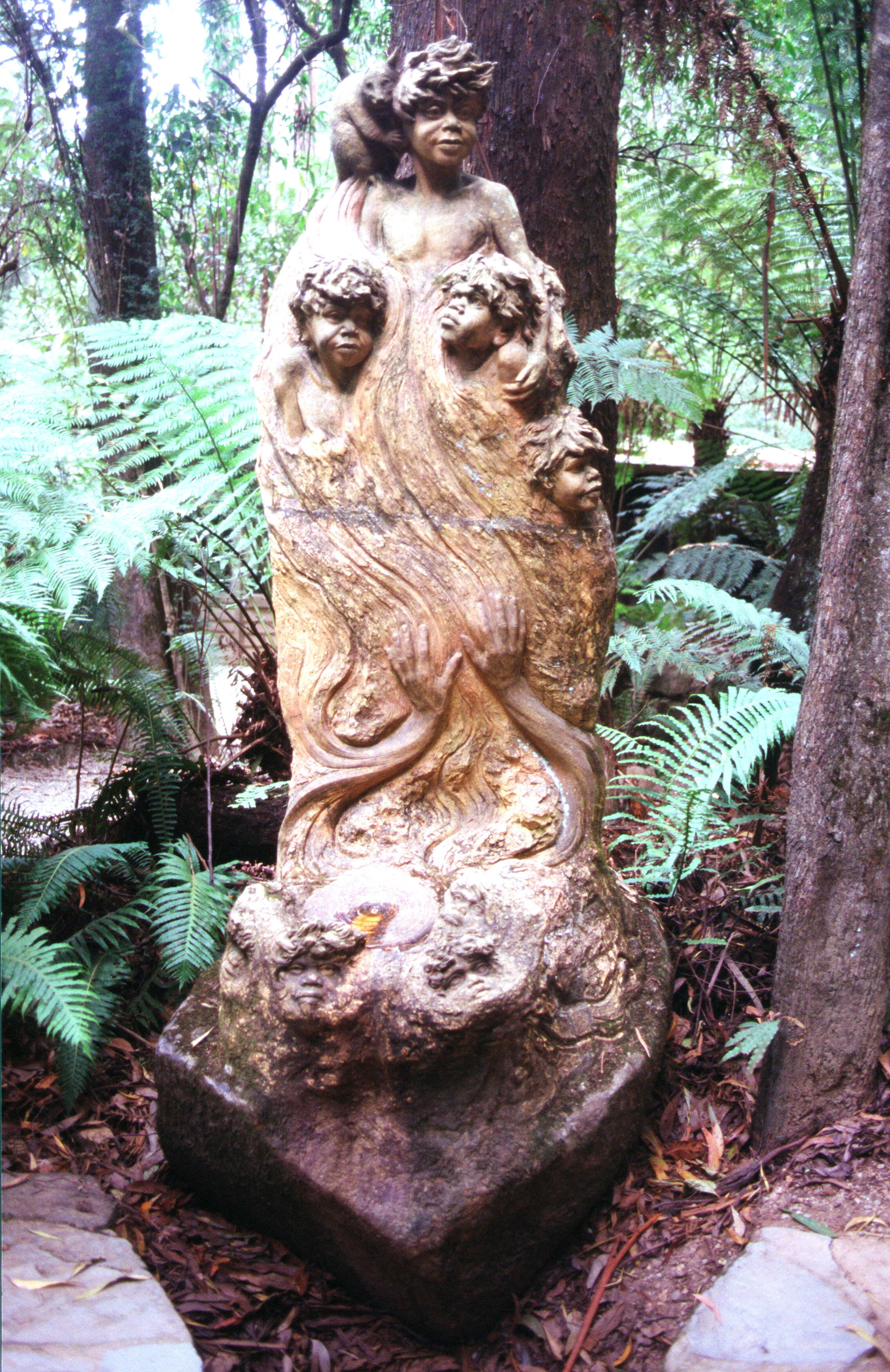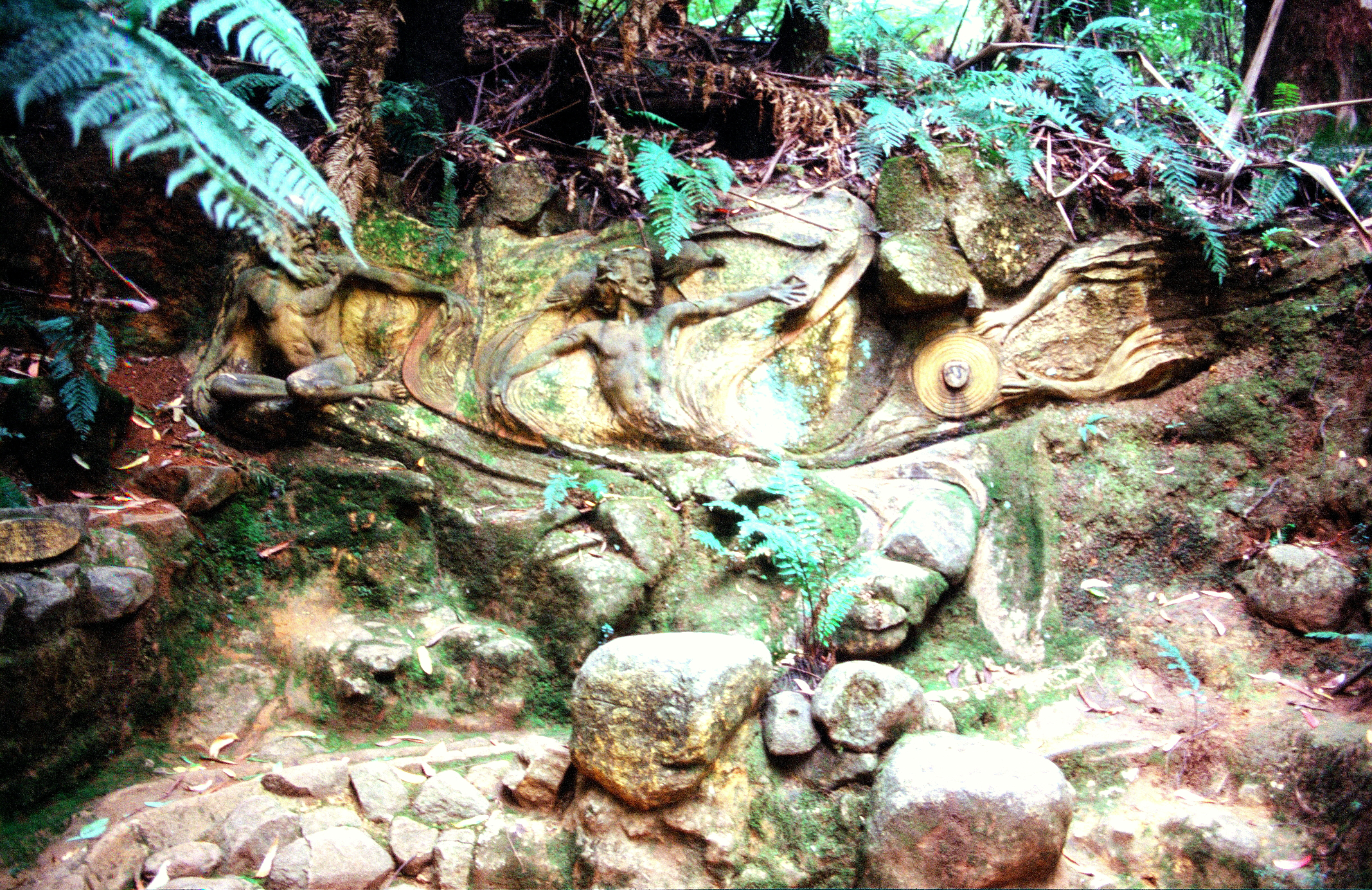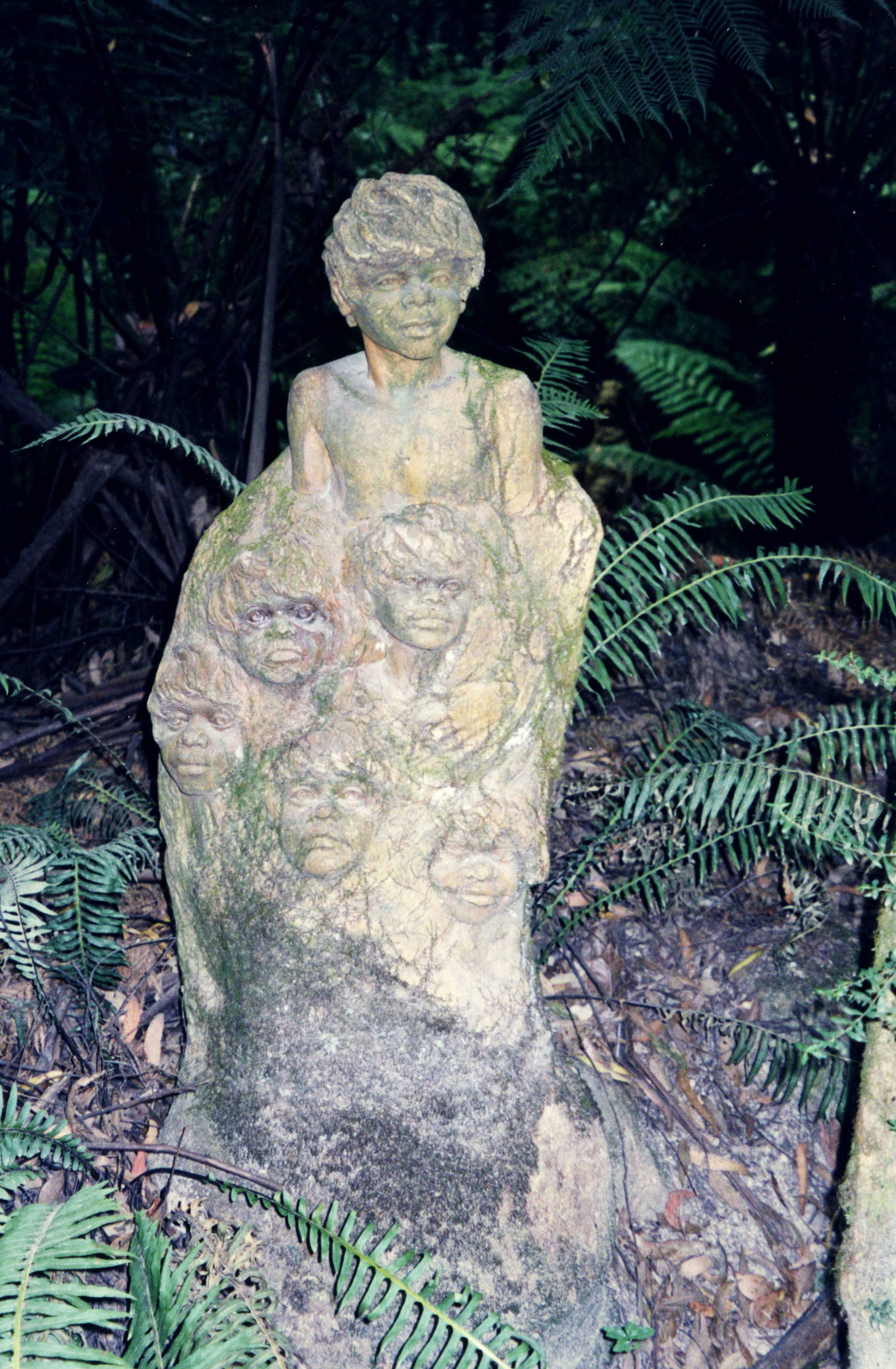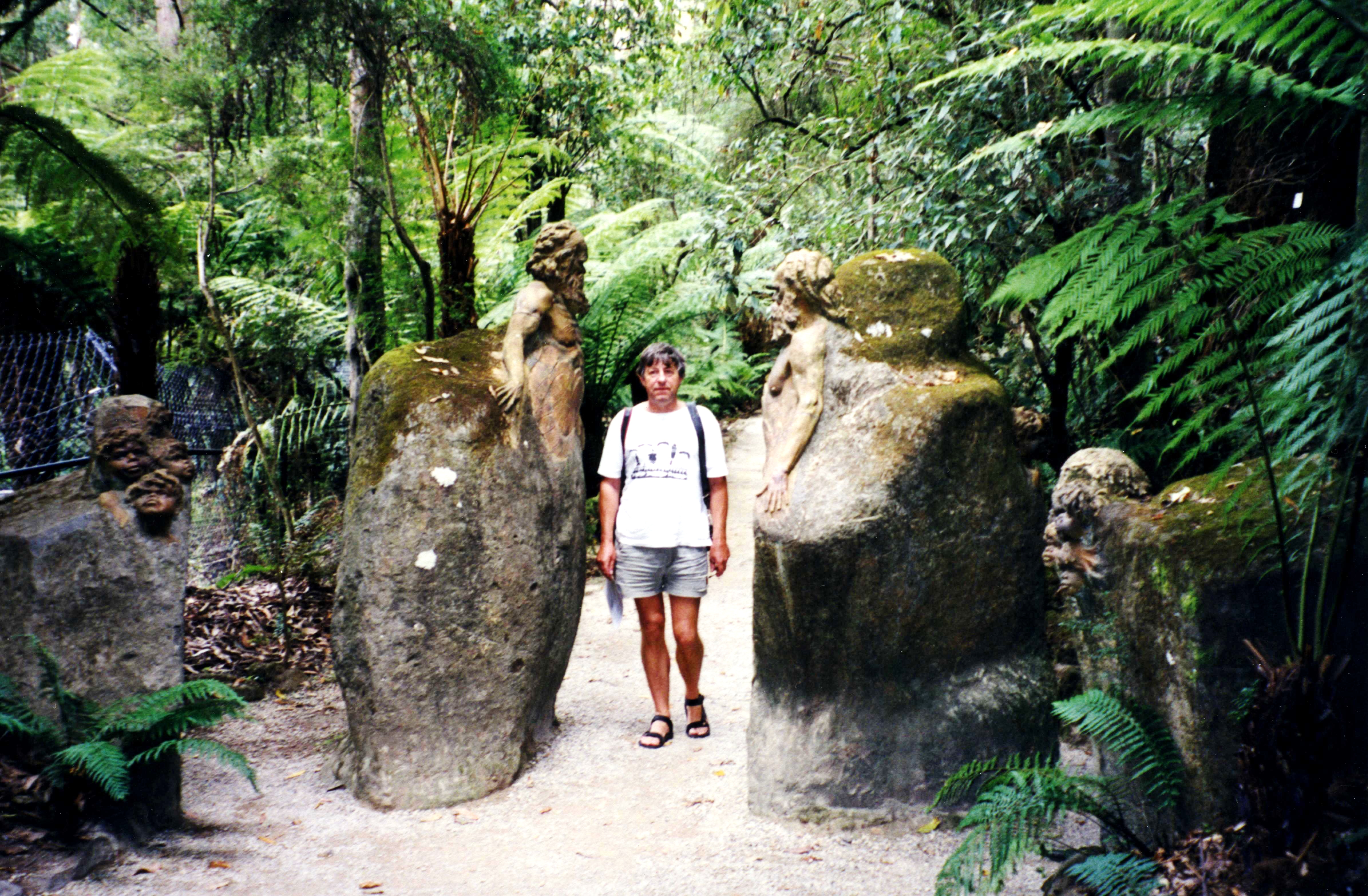 Monday 23rd March 134 Km We slept pretty well but awoke early with lots of crashing and banging. We phoned Emma about 7.00 and we got ourselves a bit sorted out, had some cereal and left at 8.20. We had to do about 200 miles in the van and then return here for them to check all the nuts and bolts on the engine and put in antifreeze, so we had decided to have a trip up into the Dandenong mountains. We had some difficulty in getting out of Melbourne towards the Dandenongs. Eventually we stopped at Endeavour Hills shopping centre and bought up Safeway and we each got a nice bun which we had with our tea and coffee when we'd finished our shopping. We then proceeded via Belgrave to the William Ricketts sanctuary. This was in an area of huge trees, the whole area there, the Dandenongs, is very attractive very green very hilly, very lush. This particular sanctuary contained statues, which William Ricketts had sculpted in clay and merged into rocks in his garden area amongst the trees. The sculptures were of Aboriginal people with very cherub faces and are very beautiful and inspirational. There were words and sayings near to go with them. We bought a book about the man and the place, so we could have some of his sayings written down. It was a very beautiful place, very serene, but it was unfortunately marred by the presence of mosquitoes and by the fact that the road running nearby had traffic on it quite a lot of the time, so didn't get the feeling of peace that we should have done.