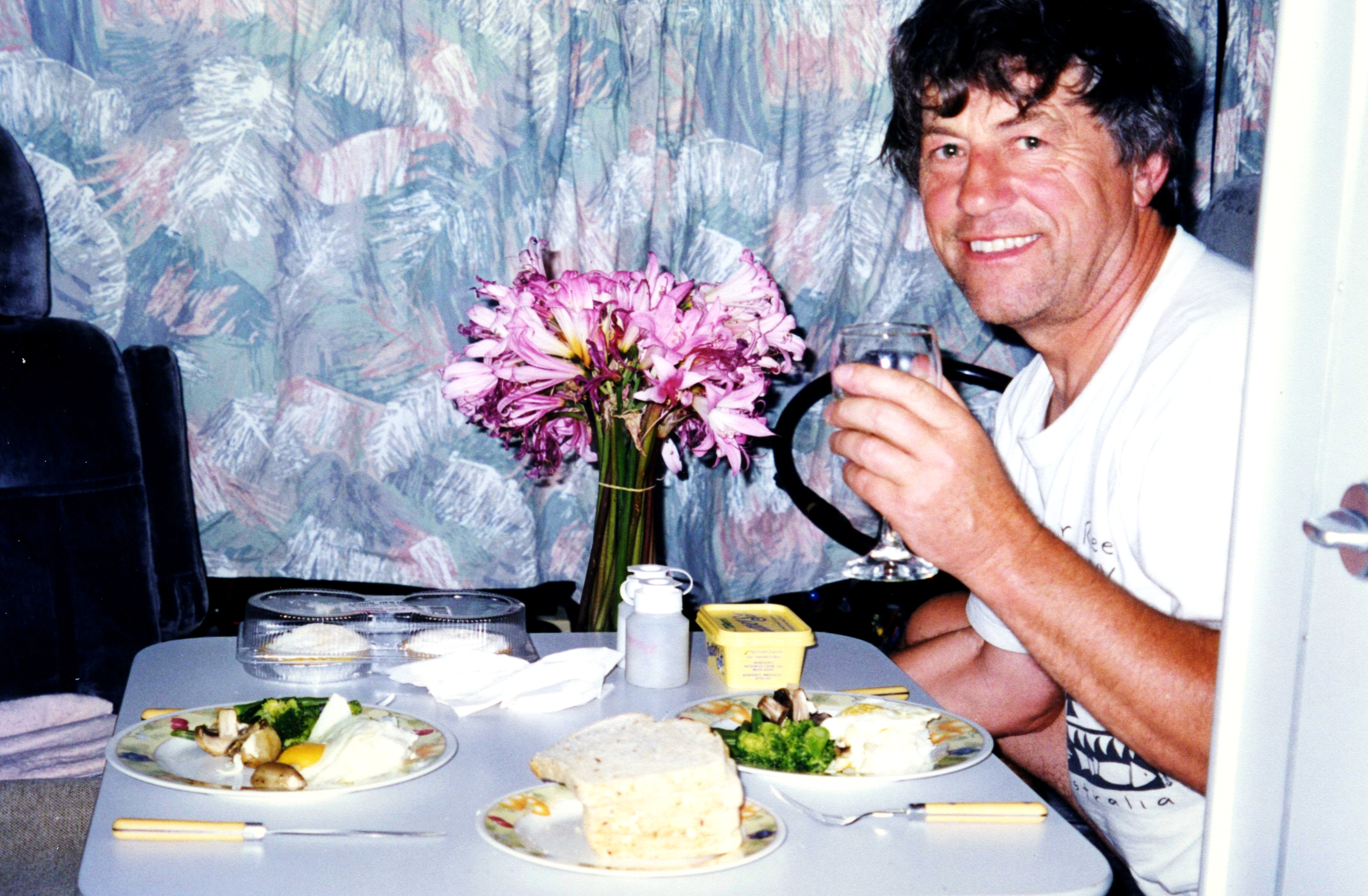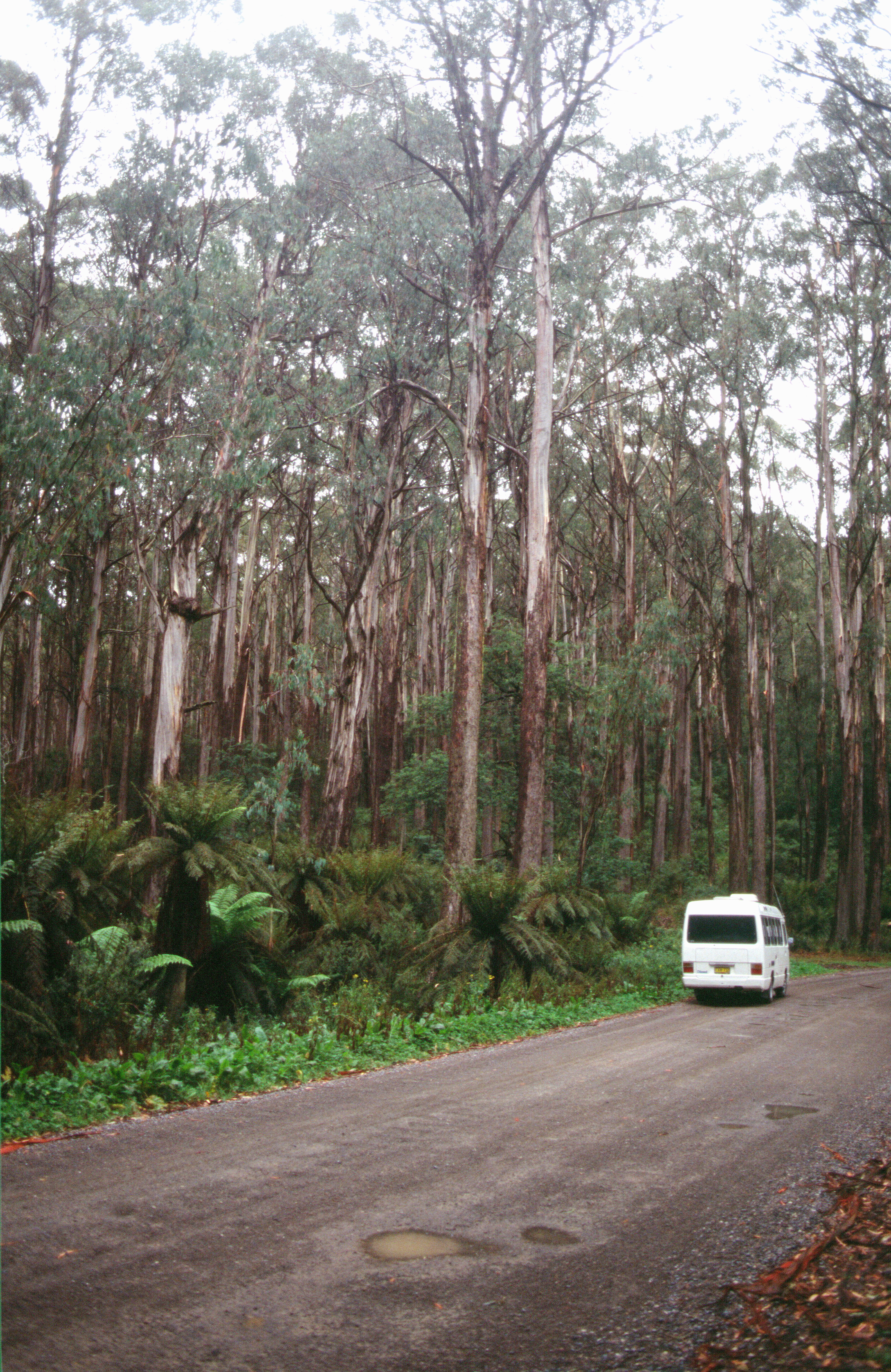 Having said that, the place was very fitting for us to visit at this moment having just come back from an Aboriginal site and this was a white man who, 50 years or so ago, had seen that the way the aboriginals had been treated wasn't right and he did his bit to bridge that gap. From there we moved on a bit and stopped by a lookout over the Silvan reservoir which provides water for Melbourne and this was looking down over a huge area of future forest. It had become cloudy and actually rained a bit - something we hadn't seen for a very long time and since we'd been on our travels in Australia really. We'd very soon got back into the way of travelling with a van and were enjoying it enormously. We stopped at this lookout for lunch and had some lovely rolls bought at Safeway this morning and other goodies which we had got, silverside and salads things. Two ladies asked if we would take photograph of them, one was English, visiting an Australian friend. We talked to her for quite a while. We gave the Australian one the travel bug again hearing about our adventures. We moved on along roads mostly unsurfaced through deep forest and came to the dam of the Silvan reservoir. They’d made it into parkland and opposite was a place for a picnic. Lots of different trees. We went in there for a short time but it actually was raining. Soon afterwards, we came across some flowers at the side of the road for $1 and I bought a bunch of the pink lilies that we've been seeing. I didn't really have anywhere to put them. A bit further on again we stopped for Adrian's snooze and by now it was raining hard. This area was again heavily forested, particularly a part called the Black Spur. Huge trees towering up to the sky, crowded together with a lot of the trees with very white bark shining up and also at ground level, tree ferns, so that the whole thing looks very densely forested, majestic and quite spooky.