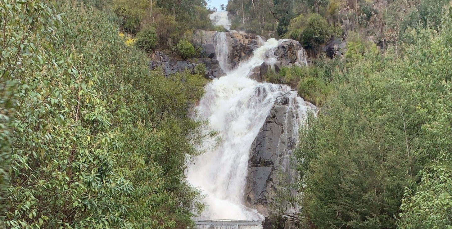 At Marysville, we turned off to drive several kilometres and then walk 350 metres to the Steavenson Falls. These were quite majestic and towered amongst high trees and in a deep deep ravine. A lot of tree ferns. It was also very wet, it was raining hard.