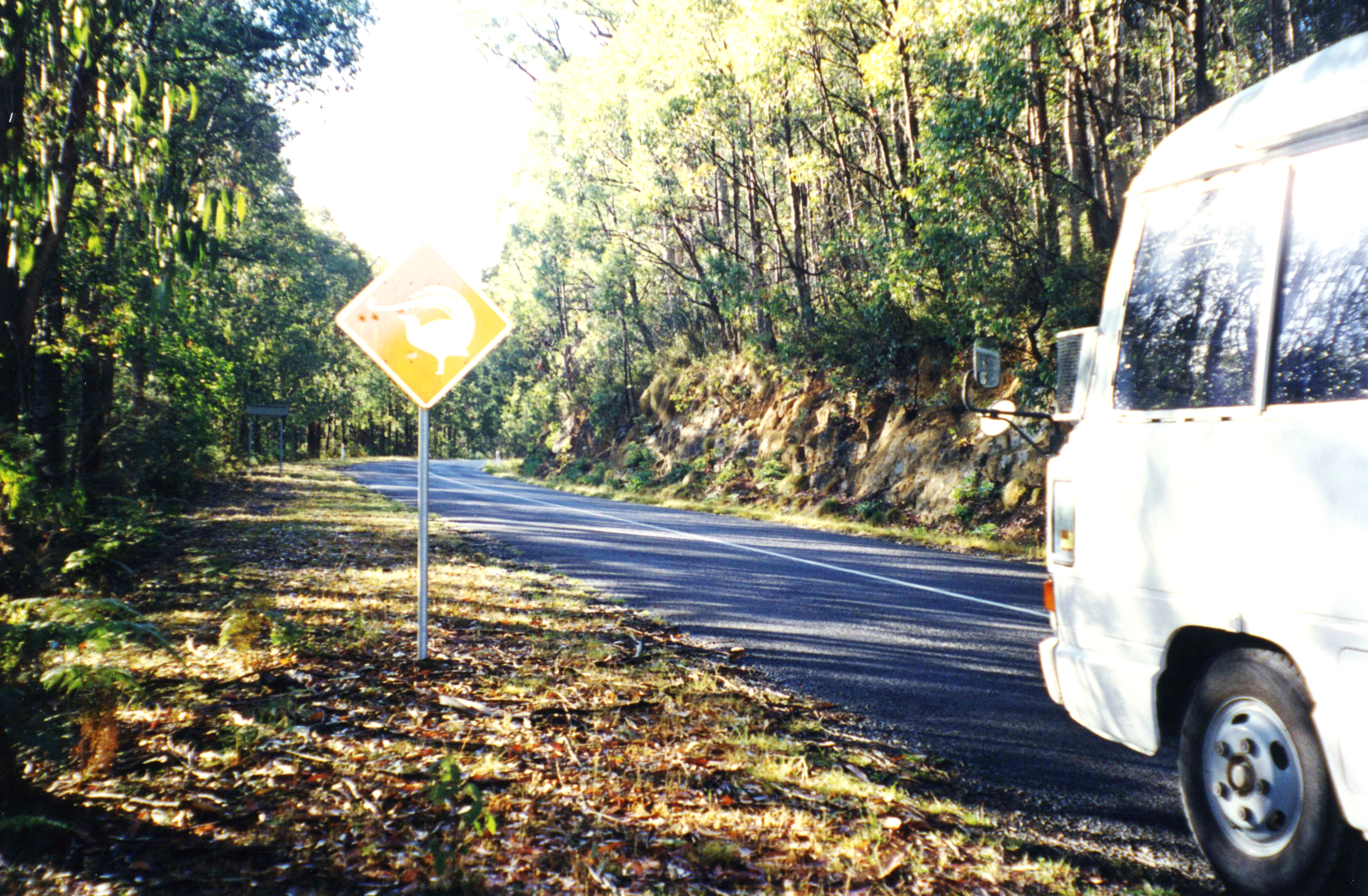 Tuesday 24th March 199 km It was a cold night, we had the eiderdown on. It also rained during the night. We phoned Tom and left about 9.00 am. Just up the road we stopped at Nicholl Lookout and looked out over deeply forested mountains, no habitation in front of us at all. Just after that I took a picture of a 'Watch out for Lyre Birds' sign and later we did see Lyre Birds.
