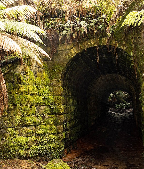 A little bit further on we came to a thing called the Big Culvert. This was a bridge over a stream which the road went over - all of 100 years, it didn't seem very exciting to us, but the rainforest we went through for a few 100 yards, to walk to it was quite stupendous [it seems it was built in the 1870's to take the Melbourne to the Jordan Goldfields road over a deep ravine - now the Yarra track]. There was still a very chill nip in the air. It was dense forest - lots of trees and absolutely silent. There was an occasional bird and water was dripping down from the trees and the sun shining through so quite a wonderful impression to remember.