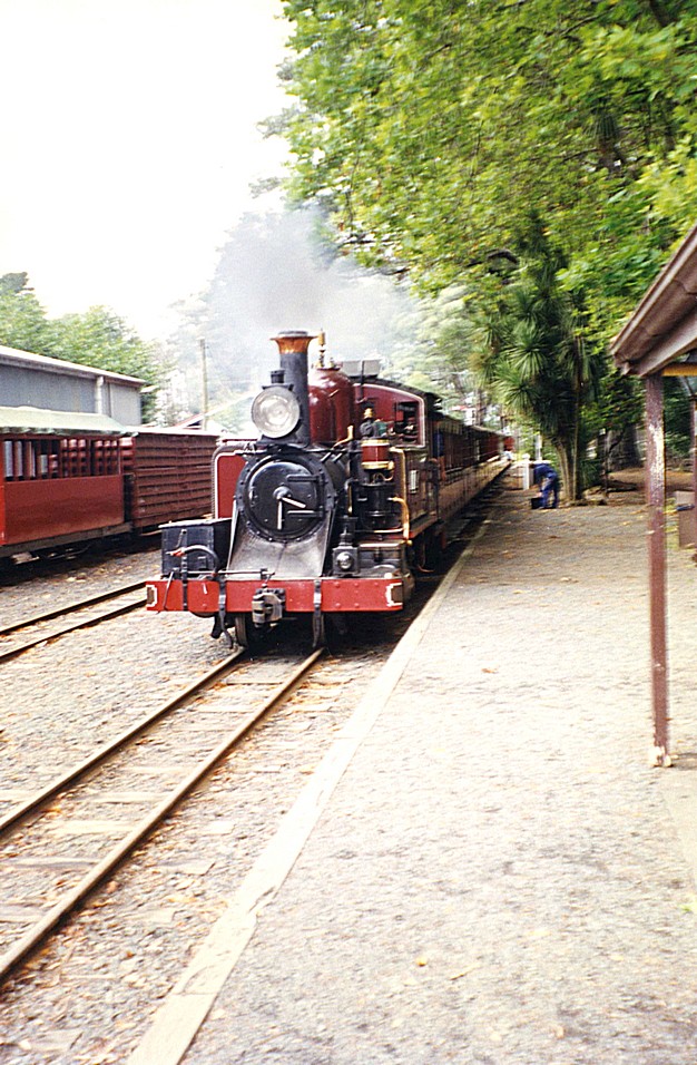 We stopped at Warburton in a picnic area beside the road, with lots of tall trees on either side, obviously an area of recreation for the people of Melbourne, where we had coffee and biscuits. The sun was nice when it peeped through but in fact it felt pretty chilly and damp. We were by the Yarra River which just looked pretty wet and there were puddles on the ground and after a morning of no traffic at all, we were back into inhabited areas. We'd actually seen a lot of Lyrebirds up in the forest. We stopped in Yarra Junction and went to the post office and got some stamps and then also some rolls for lunch. We looked in Sharon's camping shop, it was raining. At Emerald we came to the Puffing Billy Railway and on going across to the station we saw that a train left in about a quarter of an hour. We hurriedly had to decipher the timetable, went back and made up some rolls and got on this little steam train, intending to go to the end of the track at Belgrave, but in fact what we hadn't expected was it to be open trucks. The first class only had glass in the windows and the day which we had thought might have come out sunny as it was meant to be warm, was very cold and raining and within a few minutes we were both chilled through.