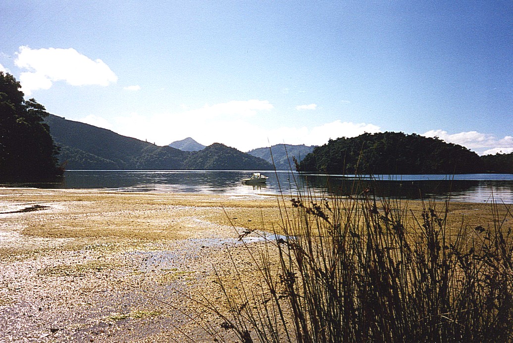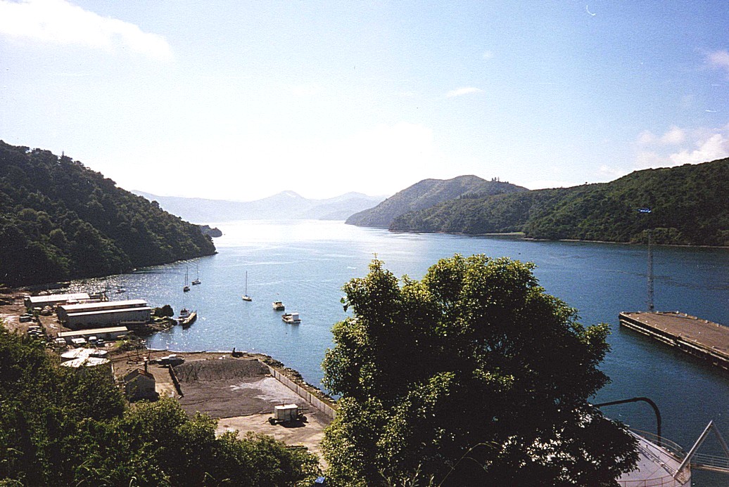 Just before Havelock we came to a viewpoint at Cullens Point, where views in 360° were quite spectacular – a wide valley between wooded hills on one side and sea and hills in all other directions. There was a circular one hour walk here around the point, which we decided to go on. It was 3.00 pm when we left and the sun was very warm. I decided not to wear my shorts, as I thought the pathway might be prickly. However it had been recently "mown", so it wasn't a problem, and was fairly wide – only once or twice did it get a bit narrow, so that I nearly had the collywobbles, as it was quite high above the sea and steep. We had followed a cable for the first half of the walk, and wondered what it was for. We decided it was the telephone to a remote house across the water – approachable only by sea. The first half of the walk was in sun, then we went into shade and the vegetation immediately changed to rainforest. There were some trees with black trunks – we thought at first that they were burnt, but realised that it was a type of fungus growing on them. It was very attractive to wasps or bees – we didn't stay to find out which!