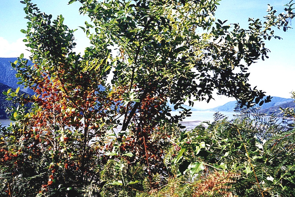 The sun didn't come up behind us as we'd hoped – it was a grey morning and stayed that way all day. I tried telephoning Thomas, forgetting at first to add the 1 to the code, then realising it was the answerphone, put the phone down immediately, but it had already grabbed the $3.30 charge! Adrian attempted to make toast over the gaz ring to go with our spaghetti! Only half successful. Our "New World" brown loaf is keeping well. We had sat in bed writing the last few postcards, so it was 10.30 when we got going. The area around the thermal pools was quiet and empty. An hour later it was packed with cars and we passed lots of cars apparently coming out for the day. We called briefly in at a shop, buying only milk and another phone card, then attempted a Woodland Walk at the far end of Hamner. It was delightfully autumnal – leaves underfoot, trees laden heavily with berries and the more subtle yellows, unlike a brilliant reds and oranges for autumn. The air too felt autumnal.