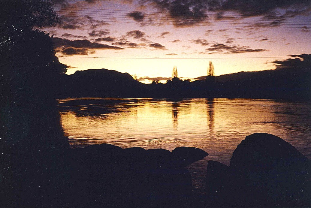 By the time we returned from this peaceful walk, it was 5.00 pm, and we had to decide what to do. It seemed a bit cold to stay here, but there were no campsites near. We decided to head on as we could always stop if necessary (actually we found out later we had very little water). This proved to be the right move, as the 30 mile drive through the Buller Valley was exquisitely beautiful, the low sun glorious on the many distant slopes. We crossed and re- crossed the Buller River, which we will follow right to the west coast. At Murchison we turned off to a "motor camp" and stopped at a delightful forestry commission type site (next to the graveyard). We were booked in by a very young "Sharon" and parked just as the sun was setting behind the hills. We walked down to the river, which surrounds the site. The colours of the setting sun reflected in the water were magical – pinks, blues, yellows. It was quiet and peaceful – another moment to be treasured.