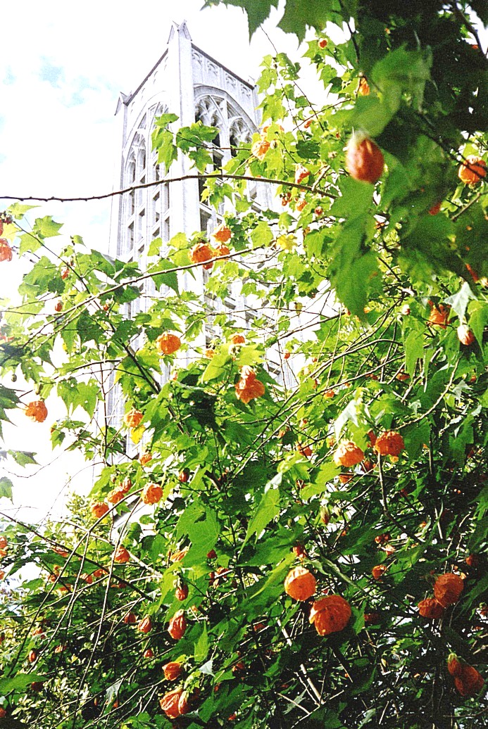 Nelson Cathedral though a shrub
