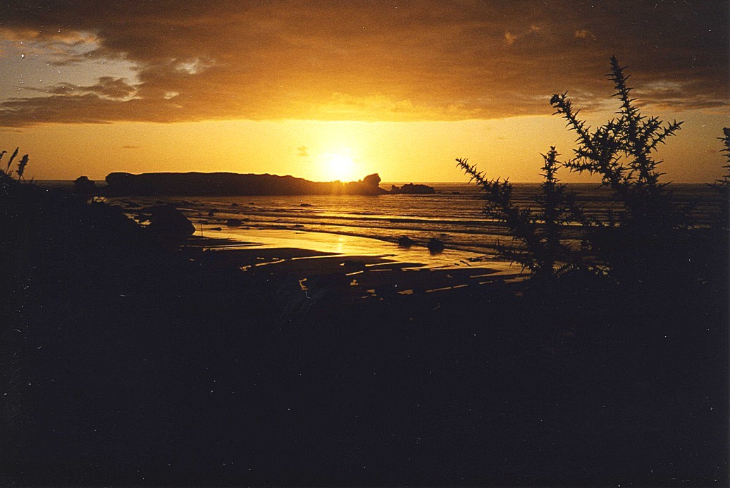 We returned to Tauranga Bay and bought an ice cream (mine hokey pokey) from a very cheery chap, which we ate on the beach. We walked across the wide sands to rocks covered in millions of mussels. A chap came and asked us where the seals were, and thought you could see them from the rocks. We pointed him in the right direction. Suddenly the tide came swirling in. We returned reluctantly to the van. We had thought we could stay at an AA site we had passed, but found out that there was a site about 30 miles down the coast set in the Paparoa National Park. This was the place to go. We followed the setting sun down the coast, past one magical beach after another. This coast was so unexpectedly beautiful. We stopped to take a few sunset photos and arrived at Punakaiki at 6.00 pm.