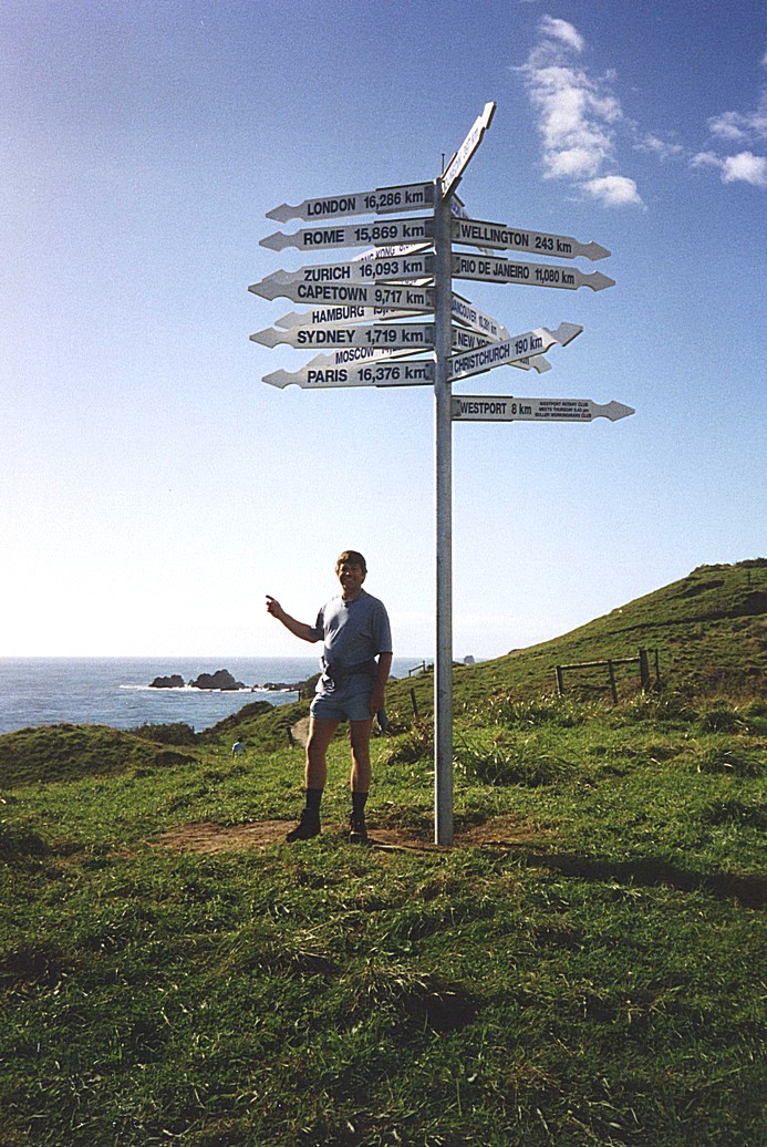 A Kiwi type bird? and Adrian by the distance signpost at Cape Foulwind