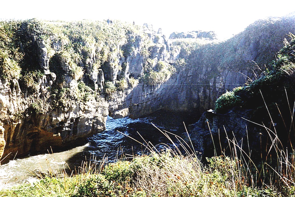 We drove along the road to the "Pancake Rocks and Blowholes". This was quite a dramatic place with wonderful rock formations and the sea bellowing up. It is more dramatic in rough weather, but we were happy with the hot sunshine. There were lots of visitors here, including two coach parties, but it is Easter Sunday and the place was beautifully set out to cope with visitors. We called in at an attractive craft shop opposite and bought one or two things, mostly wood.