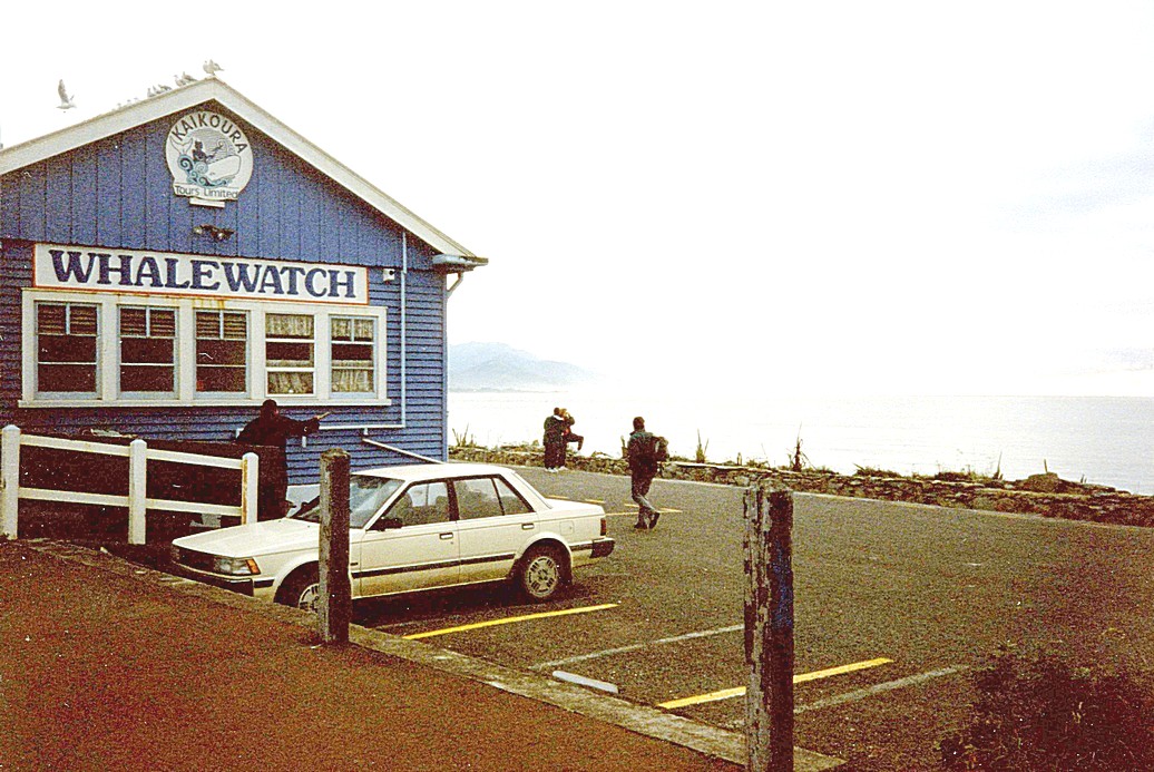 The road was unsurfaced for much of the 80 miles or so and just as we thought it was going on for ever, we caught a glimpse of the blue grey tranquil sea and we had almost arrived at Kaikoura. Kaikoura is set on a peninsula, most of the town being on the northern side and not connected to the quieter southern side, but it is from here that all the whaling and dolphin trips start. We visited the southern side first – it was reminiscent of little English resorts in Kent or Sussex, but it really belonged to the wildlife – hundreds of birds of all varieties – the red billed gulls have colonies here – man seemed an intruder. We drove through the town on the northern side, right around to the end, where we parked and realised that we were looking out to a colony of fur seals. We hurried over flat rocks to view them closer and were just about to leave when one popped up just in front of us! We were so transfixed that we almost got stranded, as the tide had come swirling in all around us!