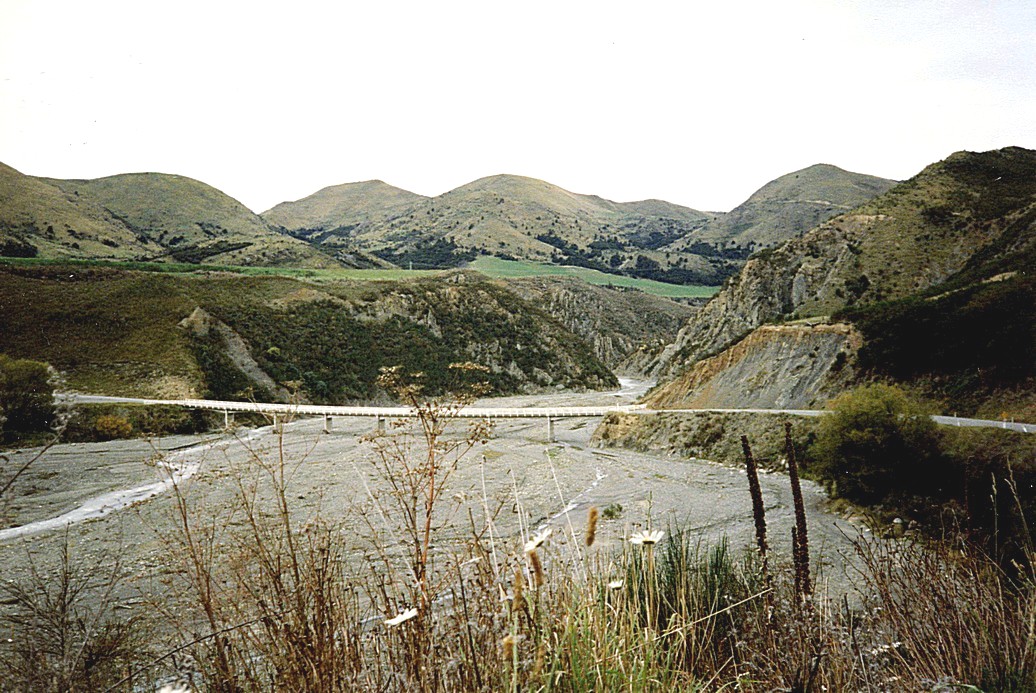 We were now taking the road to Reefton. We followed one river after another today. This was still the Grey River. After Reefton it was the Inangahua, which we had crossed on our way from Murchison to the coast. We were now going through the Victoria Forest Park. There was virtually no habitation and the scenery was dramatic – constant steep hills, sometimes stark, sometimes forested. There was some habitation at Springs Junction, then we climbed to the Lewis Pass and down the other side. There was often a very long steep drop down and rarely a crash barrier.
