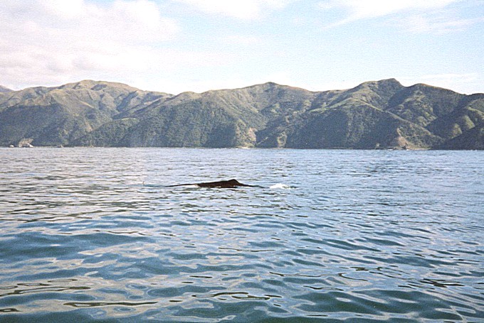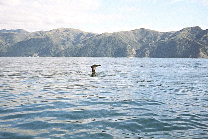 We had set the alarm for 7.00 am, but found ourselves awake just before. The morning was partly cloudy but dry. We had breakfast and organised ourselves to leave about 8.15, to drive round to the front of the "Whaleway station". Mist was rising from the sea and it looked very attractive with the steep mountains in the distance. We gathered together with the rest of our party. We were told that there would be a slight delay, but in fact on time, we all clambered into the coach to leave for the South Bay, where all the boats departed from. A tractor pulled a portable jetty into the edge of the sea, for the returning boat to pull up into. We managed to get seats at the back which was less jumpy. We had both taken our sea sickness pills! Our boat was a small catamaran and the whole operation is run by Maoris. We did in fact spot 4 whales. They are male sperm whales. The reason that there are so many here is that the sea bed goes down very steeply fairly close to land, so there is ample food for the whales. We had a slight unpleasantness on board, when the crew stopped to pick up an empty gas cylinder, which they said could harm the whales. One passenger was agitated (perhaps rightly so) that they didn't know what the cylinder contained and should have left it there. We were given extra time to make up for this, but didn't in fact see any more whales.