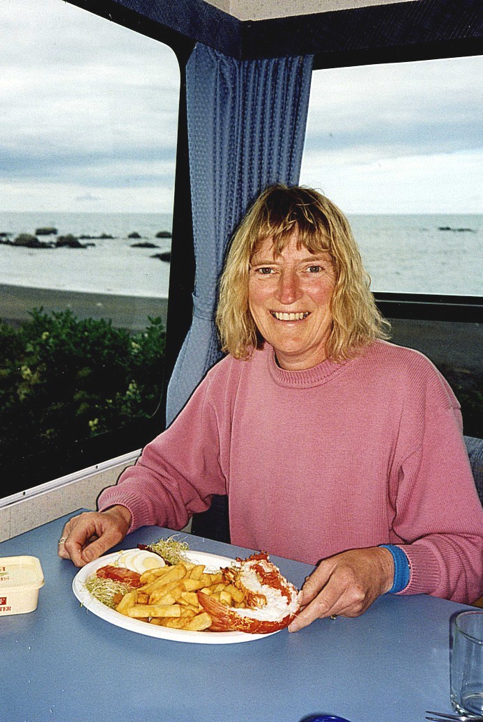 They took us in to see another group of fur seals, looking like so many large slugs lying on the rocks, but we had already seen lots of them. We were also shown an albatross. Neither of us felt a huge excitement afterwards – in fact we were both feeling a bit queasy still and after stopping for Adrian to buy a whalewatch T-shirt, we drove up to a lookout point for Adrian to have a snooze! We drove back into Kaikoura – the name means crayfish - and thought we ought to try some crayfish. They are the size of small lobsters here and quite expensive. We settled on half a crayfish and chips, which we bought as a takeaway and ate in our van looking over the sea. It made a good lunch.