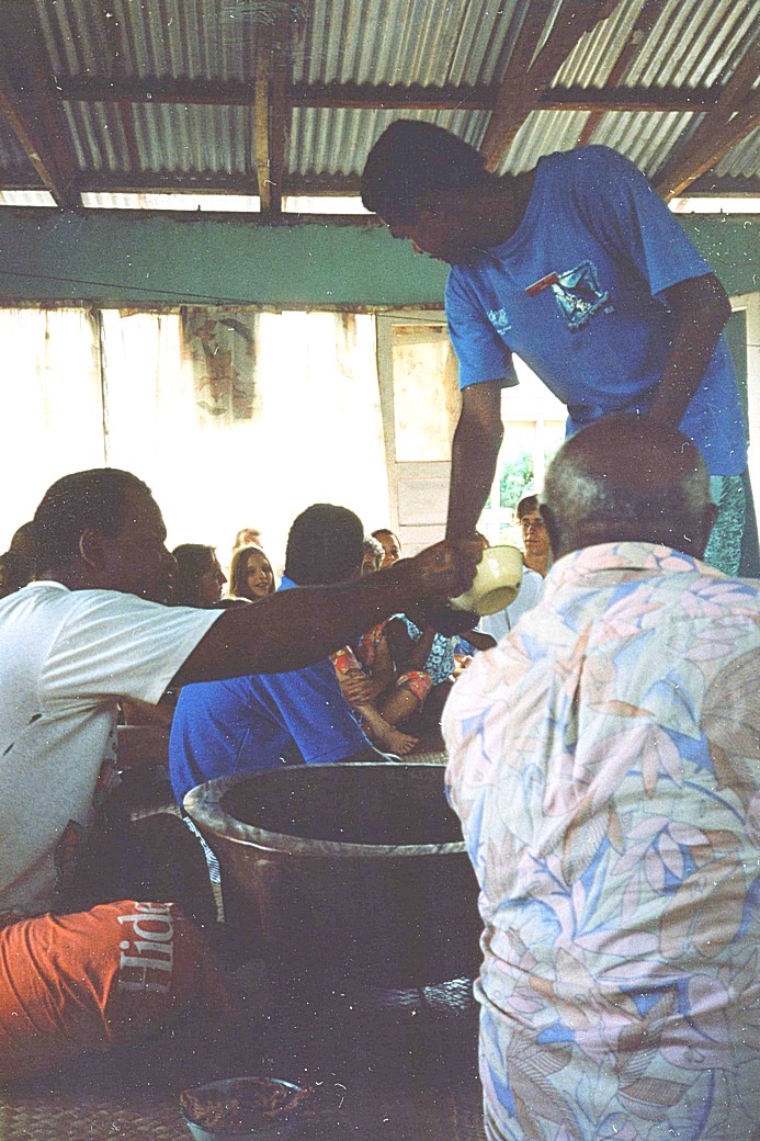 We then enjoyed toasted chicken sandwich (R) and tuna salad (A) with ice-cold water. We had watched and listened to a musical group of 3 Fijian gents outside by the pool. When we wanted to photograph them, they said "Bula" and invited me to stand with them to be photographed. They introduced themselves. One was "Big John". They then moved inside to play for the lunch guests. With flowers in their hair and "skirts" on they may have looked odd to Western eyes – but they have such warmth. We have been persuaded by the "activities" lady to join the group going to the village at 1.30. We didn't really know what this entailed, except that we met the elder of the village and the schoolchildren. How glad we are that went! A largish group of us set off – perhaps 30. All were Australian except for us and another English family. We walked along the road a short distance – perhaps a quarter of a mile. We then went into the village – a series of huts in a grassy area. We had to wait a while for the retired teacher to appear. He led us into the church, where he talked to us for a while. It was a very simple church. He was a very sincere man. He said that Christianity had been in Fiji for 160 years. It was mostly Methodists and Catholic. He was grateful to the white man for bringing Christianity to Fiji. He led us after a while to a house, where we all removed our shoes and walked in and sat cross legged in a large circle (we had previously been asked to remove hats and even sunglasses were pushed up on to heads; as respect for the villagers). We then engaged in the Kava ceremony. This is explained well in the text opposite, but did take place just as it is written. There was a great solemnity and sense of awe. One man continually rung out a "rag" in the liquid in the bowl. When eventually it was ready, it was handed to each in turn to drink – a half coconut full. There were 2 claps as the bowl was presented to each person, then 3 claps (I think the claps come from the sound of the coconut breaking from the palm and then dropping to the ground – it has just the same rhythm). Each of us drank the Kava (it tasted foul – rather like water from the greens) and while this was going on each person also had to introduce himself (Adrian was the first).