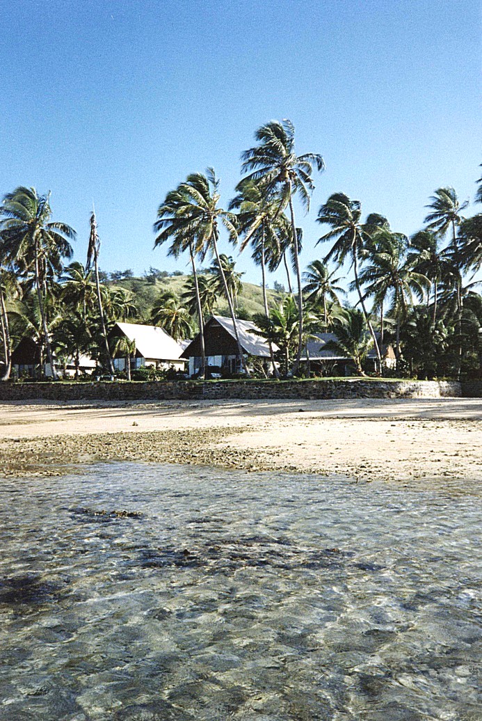We had viewed part of a tourist advert on TV this morning, advertising Christchurch and I quite thought it was England – just the people seemed to have more time and there is so little traffic for a "city"! We walked back to the tram stop and there was our tram – it had done the "loop" and was back again. We continued the rest of our circuit, while the driver and a conductor this time, chatted. We are alighted at the square and bought a hokey pokey ice cream from a friendly lady and sat to enjoy these. A spiritualist lady came up and spoke to me just as we were about to leave, then we had a quick walk back our hotel, arriving just on 11 o'clock as our shuttle bus, driven by a non-commutative young girl – arrived. Now was the time to leave for the airport – we picked up a couple and their 3 young children, and dropped them at Leisureport to collect their camper van (can we start again please?) We had passed all the neat autumn suburban gardens again, many with their pink Nerines in front (I planted my just before we left!) At the airport we booked straight in, then had a quick look around the shops – I at last bought my Paua ring which I have wanted. Our flight to Auckland – 1hour 9 minutes! was pleasant. At first we could see the Canterbury plains and the barren hills beyond. Then we went into cloud. We were served a pleasant snack of open ham and cheese sandwich and a Danish pastry. At Auckland we had had 3 hour wait and had hoped to get a trip out, but this proved not possible. We spent time looking in various shops, particularly the bookshops, then we walked across to the International Departure (900 m). It was pretty warm and humid now. At the International Terminal we wasted more time, looking in shops and having a snack (I had some much missed toast!) – that we almost missed the last call for our flight! Our plane to Fiji had only 80 people on it! (While waiting at Christchurch, the man next to us, a farmer, got chatting and relived his 1963 trip to UK and Europe – by ship – with a friend, He had bought and later sold a camper van. He got so involved in talking to us, we nearly missed our flight call!) Our 3 hour flight to Nadi was pleasant with a nice meal with good dry wine. We watched Mr Bean (Strepsils) and Clive James on the 60's. We arrived a little ahead of schedule (8.00 pm). We were soon through customs and greeted by lots of friendly Fijian people and given a necklace each to wear. Everyone smiles and says "Bula" (hello). We were transported by minibus for the journey to the "Hideaway Resort". This was longer than we expected and it was 10 o'clock when we arrived. Being dark, we couldn't see much of the countryside, but it appeared very English – English road signs and English weather – it was raining! It seems we hit the rainy season. Very humid though. Our driver talked quite a lot – mostly to the other people in the van. He said tourism was the first industry and sugar the 2nd. We couldn't hear much of what he was saying - our ears were still recovering from the flight – mine didn't recover at all at Auckland. The Hideaway Resort is very attractive. We have a little "chalet" right on the shore, fringed with coconut palms. Exotic plants abound. The towels in our room were fanned out with a red hibiscus flower and greenery in the centre. We had a little walk around outside (in the warm rain). A disco was playing foul music – luckily away from our room. A tiny lizard ran across our floor. On the beach were tiny crabs scurrying and lots of bits of coral. Fish leapt out of the sea. Pretty tired, at midnight, we fell into bed.