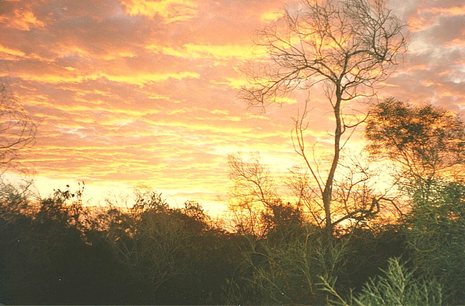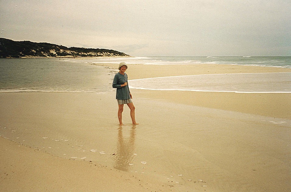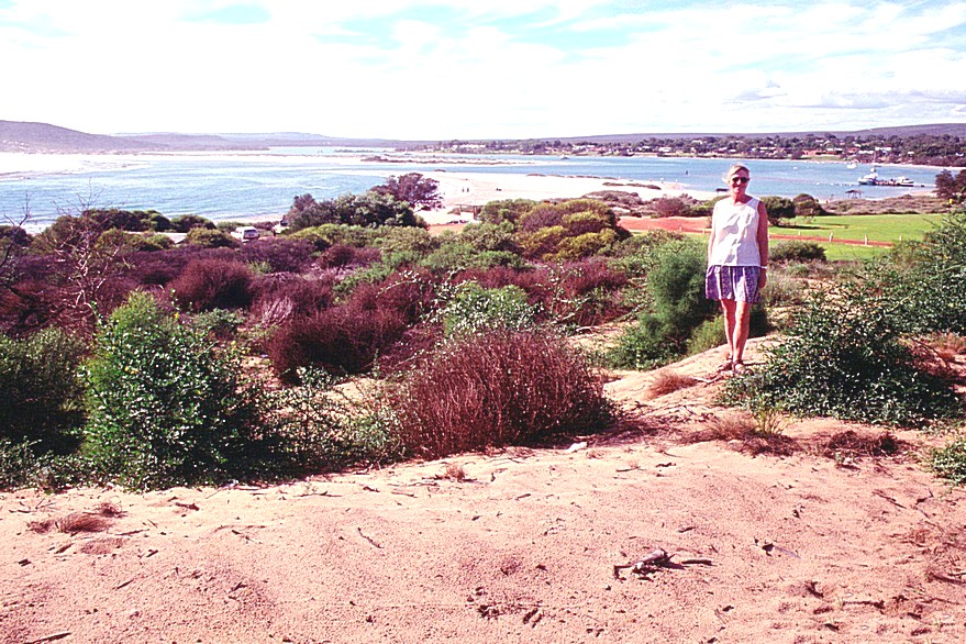 A grey morning, but we'd woken up with birdsong. The big rock behind us was just lit up by the sun, but we didn't see the sun apart from that, it was just a magical moment, which was rather like an Ayers Rock. We'd gone to bed hearing the frogs and woke up to them as well and together with the birdsong, it was very lovely and we resisted putting the radio on for a long time to listen to these sounds. When we did, we heard about Pakistan having done nuclear tests, as India had. After breakfast we returned to the Brand highway and drove back to Greenough and going up the main road, passed again the bent tree this area is famous for and a field of sheep with tiny newborn lambs. We drove down to the mouth of the Greenough River. and first walked out to the ocean. This river ended with a sandbar across like so many others. By now, it was a cold wind, but sun was warm. We moved down to the river a little and stopped there to have our coffee, and then went for a walk for a little distance along the river and then back up a bit higher, so had some nice views. The path down by the river was pretty non existent. The path at the top was a superbly made path past a group of schoolchildren who were out picking up litter [ Rosie doesn't mention it here, which is strange, as it became one of our 'popular' sayings . One of the girls found something interesting in the sand near us, and her friend said "don't tell Sir, he'll make us write about it!"].