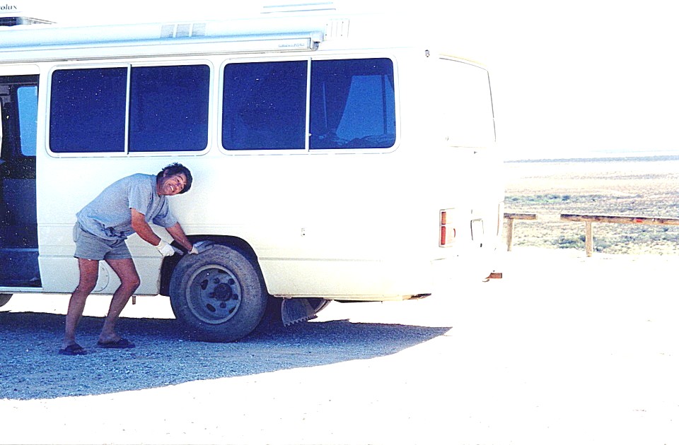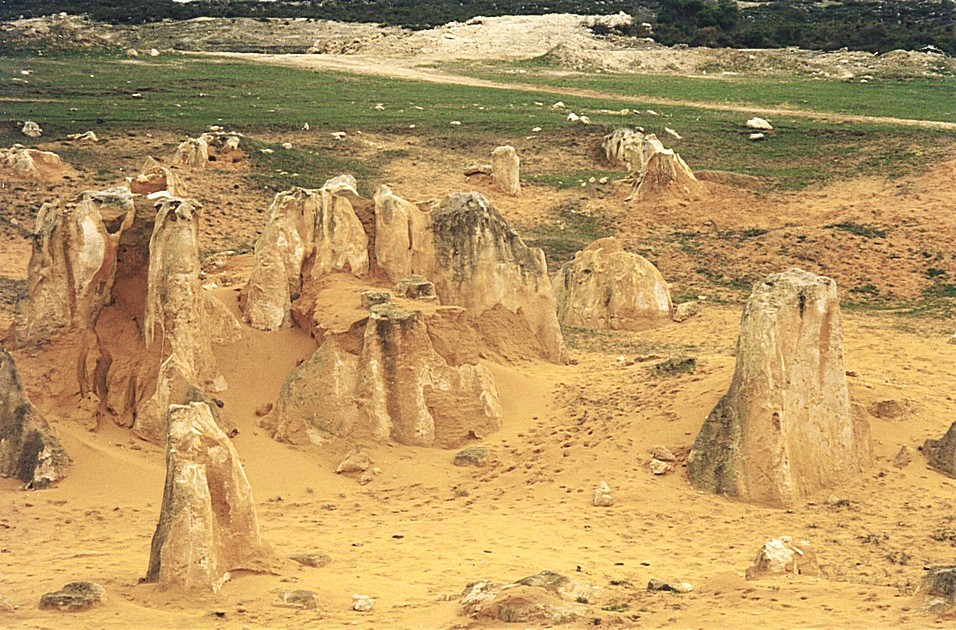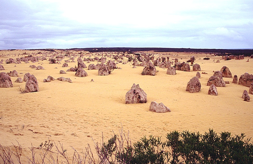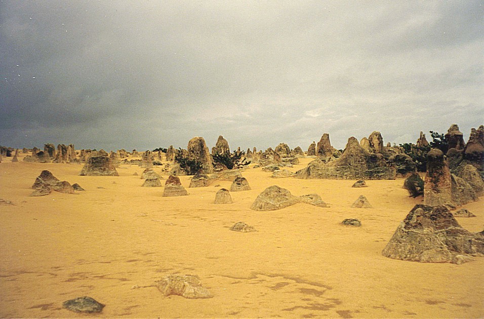 We actually had a very disturbed night. We thought the problem would be the nearby road and the traffic from the road trains that went along this main road, but the real problem was that it came on to rain in the night and the wind blew and as there were lots of trees around, it all made it not very easy to sleep. We were very late getting going therefore, it seemed very English and we looked out to very heavy rain and everywhere very wet, but not at all cold. So we just enjoyed lying in bed in the rain, and got going quite slowly, listening to the radio which was a phone in programme about National Sorry Day in Australia, which it is today, being sorry for the Aboriginal children who were taken from their homes in the past. The travelling lady had already left by the time we surfaced around eight o'clock. We'd been amused at Adrian's reading of the cereal packet, which were called Wheaties and he read it quite understandably as Wheatles. It was gone 10.00 when we left, still raining hard and the people in tents were still packing up looking very wet. We continued up the road and stopped for coffee in an uninspiring lay by in the rain beside the road and we were looking through the pamphlets, advertising tours in this area. We have been amused greatly by the incorrect spelling on signs and in books in lots of Australian things and in the one I was reading it was the emus and kangaroos both with apostrophe S. What would Hil say? We stopped at the Drummond just briefly, which was a picnic area where there were little groups of tiny pink flowers and also some sort of yellow cotton grassy stuff amongst all the vegetation, which went on for a long distance. The weather continued in varying amounts of rain towards the coast and at one point we saw three emus beside the road and one or two wildflowers and things. We stopped off for lunch in what was called the Banksia Park. There were lots of banksias around but there had been in this area anyway and looking very attractive. It actually stopped raining while we were there. I cooked vegetable soup which was very good and I also washed my hair I think I hadn't mentioned that last night, we were down to one bowl today because Adrian sat on one of the little ‘two for $3 bowls’ and broke it. We drove on down into Cervantes and Adrian tried, and had been trying for some time, to locate two people who'd written an article in the Morris magazine and often travelled around in a Morris eight, but we were out of luck with that. We finally got to the house being unable to phone them, and it was only an occasional house and they were obviously not there much of the time and nobody was about. We did a quick look round at Cervantes and went down to Thirsty Point lookout and had a look at the coast. There wasn't a great deal to see, it's very small town. We inquired at the shell petrol station, which was the place which was supposed to be the tourist information and did tours, and she said there would be no problem with us driving into the Pinnacles today with the coaster bus. We thought after the rain it might have been soft going, so we set off for the Pinnacles just before 3 o'clock. We drove into Nambung National Park and headed for the Pinnacles for which we needed a pass, our pass a monthly one, had just run out and we tried to pretend that we thought it hadn't but the lady knew it had – she still let us in. We drove around a loop through these pinnacles and unlike Wave Rock, this was a very pleasant surprise. The Pinnacle's, 1000's and 1000's of limestone pillars were jutting out of brilliant orange sand, and against the deep grey sky and green of foliage it was very dramatic. We stopped many times and took various types of photographs there.
