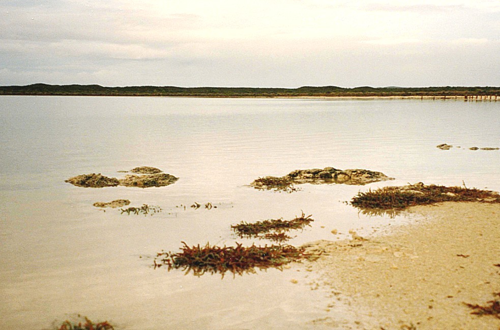 So having had that nice experience. I then did have a swim a bit further along the beach, which was very pleasant and then we both went in search of the shower and had a shower and hair wash and then returned to the van where we had coffee and tea. It was midday by the time we left, it was hot. We set off towards Denham and on the way, we stopped where we saw something funny hanging in a tree - a list of some animals or something and we could hear some birds sounding a bit like bell birds making various sonorous sounds. We reached Little Lagoon, which looked absolutely lovely and reminded us of Fraser Island, with the turquoise of the sea and the lake being a bit lighter in colour, surrounded by greenery and blue sky. We then went on a new tourist bit of road, finished earlier this year, which had a nice lookout down to Denham. When we reached Denham we went briefly into Foodland, got one or two things, went into the tourist office and got some postcards and enquired about a flight out over there but there didn't seem to be anything we particularly wanted and we weren't that keen because it was very windy and we thought it would be a bumpy flight. We then had lunch sitting on the front, it was windy, but not as windy as yesterday, the sun was hot. I'd had a go on some monkey bars’ which I couldn't resist in a little park and Adrian had managed to buy a couple of bottles of wine in a local resort hotel. There were two hotels there each having a bottle shop but nothing like the bottle shops we'd been used to where wine was a real bargain, it was very expensive there. We drove back to Eagle Bluff and it was a few kilometres down the sandy track that we'd been down yesterday, we knew that, but it had rained since then and there were two places where there was a large flood of water across the road and we had to do a bit of four wheel type driving to get through it. We managed that and positioned ourself near the sea. There was another coaster there, a couple Rod and his lady and a dog Russell and they invited us in for a cup of tea, they were like Chris and Andy Jones - he was a labouring sort of fellow. We chatted to them for some time, they were very interesting. We perhaps could understand John's attitude more - they'd got a porta-potty but never used it and he wasn't too fond of washing! We then had a long walk around the bay, it was still a quite strong wind but a pleasantly warm sun. We saw several dead puffer fish and some mangrove looking trees. Later in the evening we walked down to the beach and walked in the other direction, but quite soon we came to a little river coming out which we couldn’t cross, so we made it a small circular walk, it was very light, almost a full moon, although there were some clouds.