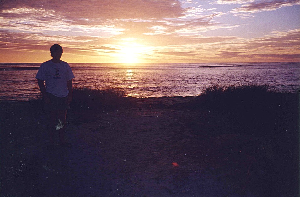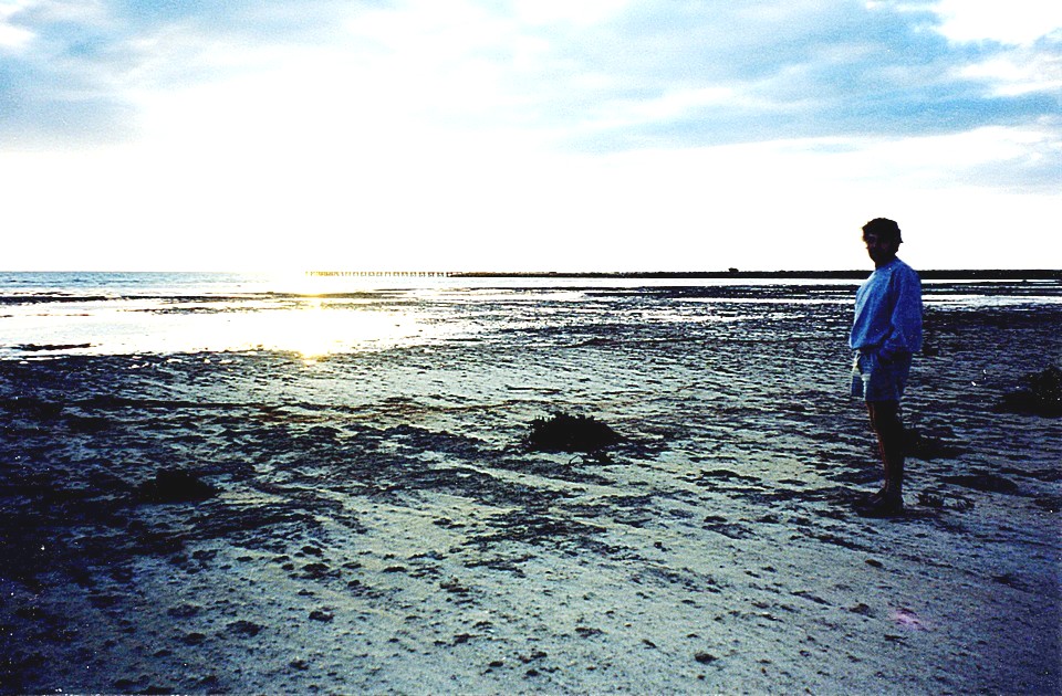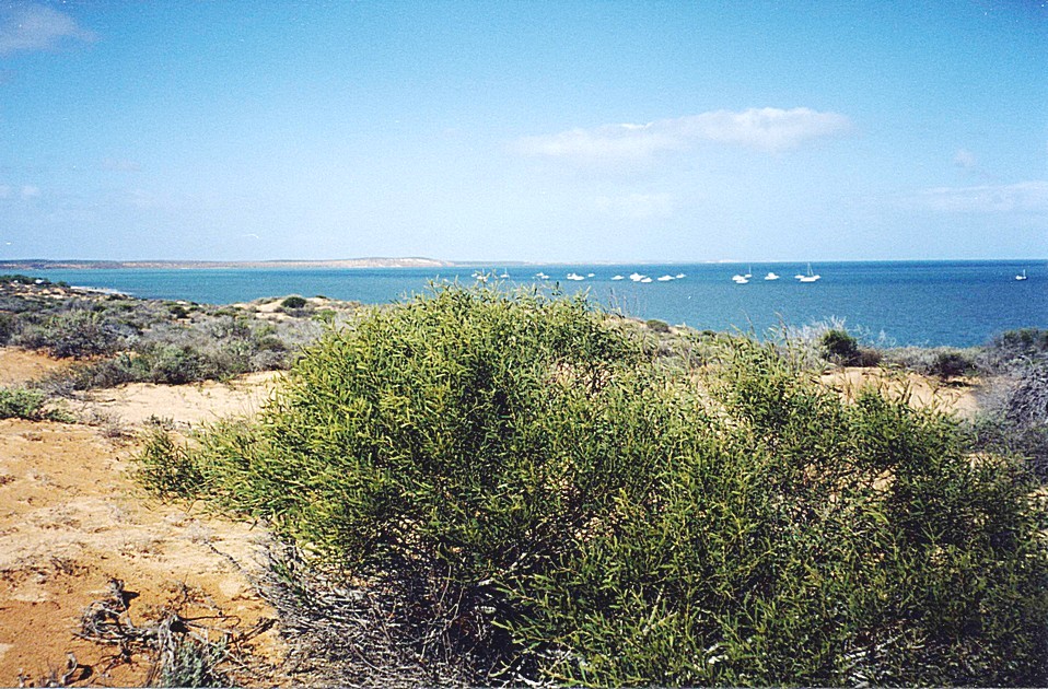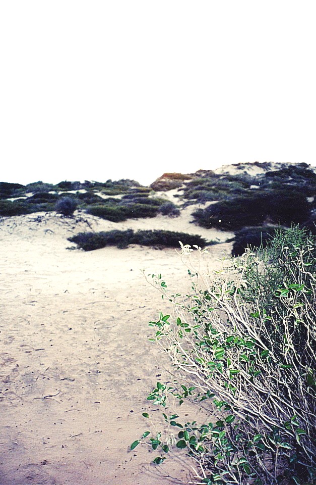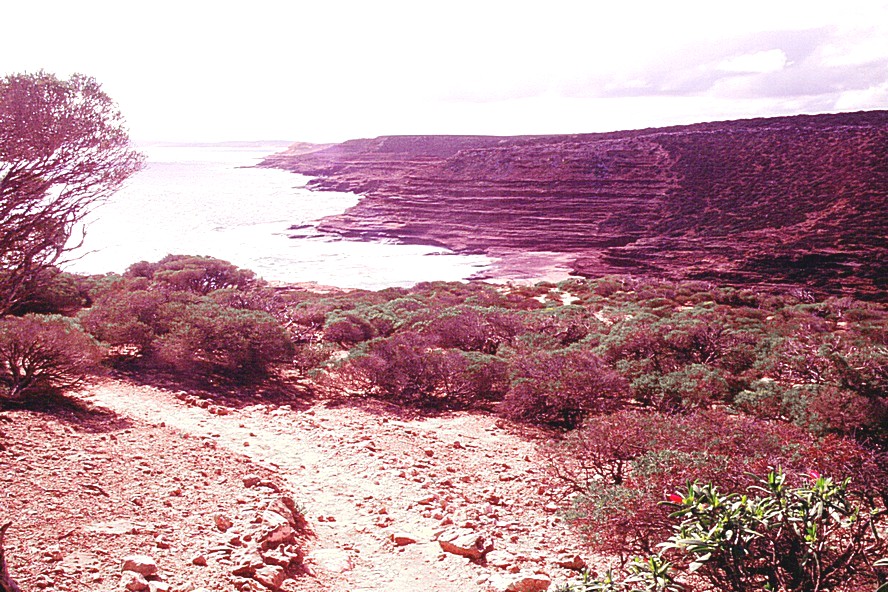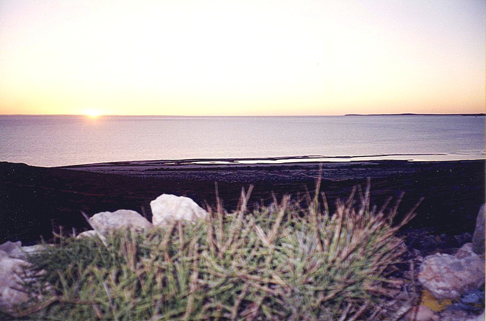 . It was very hot, there had been a clear blue sky all day and we went back to museum and had a cup of tea, which was included in the price of $5 each to see the little museum bit, so we felt it was well worth the visit. Now nearing four o'clock we returned to the road and carried on in the direction northwards towards Denham. We stopped off at Shell Beach, which is made up completely of shells and we walked across this rather wide beach to the sea. There wasn't actually anything here saying you couldn't camp but as it was in the Conservation Area we thought perhaps we wouldn't stay there. We went a few miles up the road where we turned off to a place at Goulet Bluff, down a track and stopped in an idyllic situation looking out to the sea and a bit more of a peninsula. In the distance we could see a bit of what might be Dirk Hartog Islandor anyway what we think is most westerly part of Australia. We watched the sun go down and we climbed to the top of the bluff so we could have a view of land and sea, in all directions and just greenery, the only thing altering this was our white van. We sat in the van watching the light fading over the sea and the greenery, listening to one of our earlier tapes on the Eyre Peninsula and going across the Nullabor. After that I prepared a stir fry supper with vegetables and veal and rice and later on, we walked down to the beach, a quite large moon was shining in a clear sky with lots of stars. As we walked on to the beach, I thought it was strange that we could see what looked like waves not moving but as we got nearer we realised it was just the beach. This being a long inlet, there were no big waves coming in and as we walked out across the beach, we found that this too was made up of myriads of shells. We walked across this covered in layers of seaweed, and we suddenly found we were in the water. It was very, very peaceful and the only sound was of one or two crickets. There were a couple of lights in the distance and absolutely nothing else at all, quite a magical moment. We walked back up to the van, and then sat beside it for some time, and then as Adrian was getting in, I saw a shooting star above which was just an amazing sight to see.