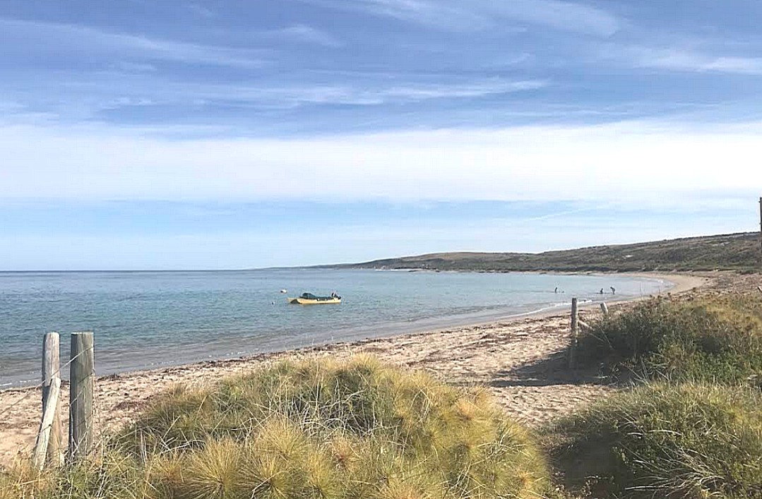 We drove a few more miles and then we came to the turn off to Gladstone Beach. This entailed going through a gate so we nearly missed it and then it was a 6.5 Km rough track and in a couple of places was exceedingly difficult to get through being rather wet. It was beautiful day as we travelled down it so we're hoping it didn't rain hard before leaving there the next day. The place is quite idyllic because there were a lot of virtually free ($1 each) campsites on the beach which was still in the inlet opposite the Francois Peron Peninsula so very calm water, there were only a couple of caravans here. We settled ourselves in, put out the awning which made the sun go in and it became quite cloudy and breezy and made a cup of tea. I washed out the new pillowcases as I’d found mine had sopped up some water from the window the other day and was dirty. We sat outside and I wrote a letter to Val and Mike and several postcards as well, one to Emma and one or two friends, but we came indoors to finish that because it actually got quite chilly, later the wind did drop again. We went for a walk along to bit of a jetty but it was quite blowy and I'd had this sore toe, so we didn’t go far along the beach.