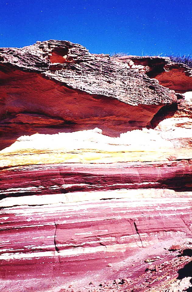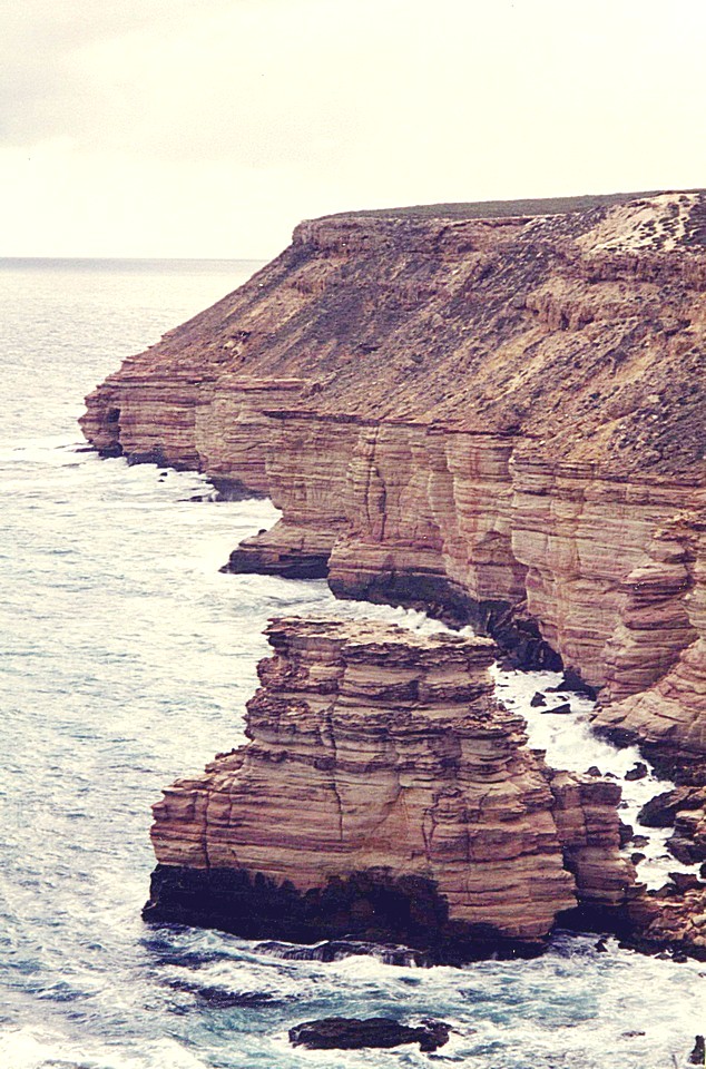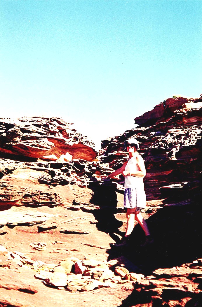We then drove on through the village and passed some so called early miners cottages and the old cemetery and we posted a postcard to Tom. We stopped soon afterwards for coffee and a bit of the nice iced bun - icing with spicy fruit bits on top, in a large but uninspiring lay by and spoilt completely by the amount of flies. We drove 100 km through Kalbarri National Park to Kalbarri which was reminiscent of driving to Rainbow Beach when we came to Australia last time, just miles and miles of nothing. Just before Kalbarri we drove up to Meanarra Hill, this was a mile or two up a sandy track and we did certainly have a very impressive view looking down to the Murchison River coming out at Kalbarri and just wilderness all around, but the fly and the ant population made it not so pleasurable and it was very hot. We drove down into Kalbarri itself, surely one of the most beautiful places on earth, as the Murchison River went out to the sea with a sand spit across and the blue sky, green vegetation and white beach. We looked in at a campsite by the end of the river, which we thought looked nice and then went down to near the sand spit and had lunch. We then went down the coast a bit stopping to view back to this estuary and drove to what was called Mushroom Rock, and there was supposedly a two hour walk , but we took a one hour on a trail down to the Mushroom Rock which itself was nothing very special, just a rock balanced on a cliff edge, but on the way we saw spectacular rock formations and coloured rocks.