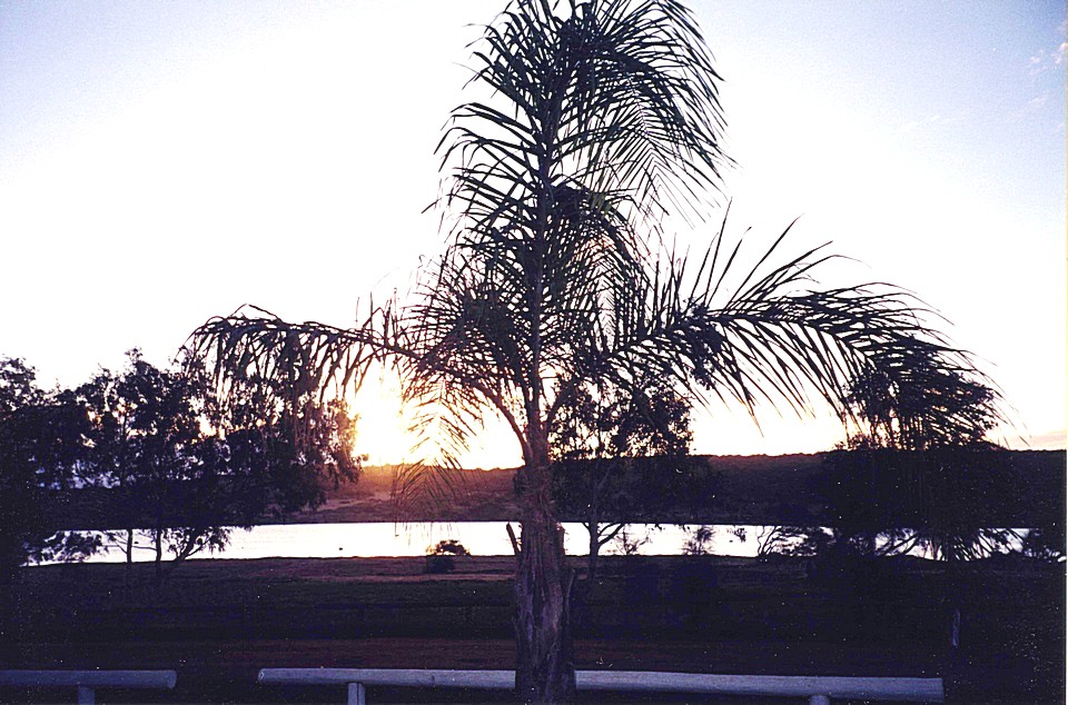 We thanked them profusely and while I got some crumpets ready for lunch, we had no bread or anything else left, Adrian began the cleaning up operation - everything was thick red with mud. His sandals had given up after falling apart completely. After lunch, instead of after breakfast as planned, and rather cleaner and fed we proceeded towards Carnarvon. We stopped at the Wooramel Roadhouse where Adrian checked the spare wheel air pressure and a bit further on we pulled into a layby, which had some water lying in it, where he washed off some of the muck from the wheels. We crossed the Wooramel River which was wide and thick and red, and then whole sections on either side of the road were flooded with red coloured water. We passed lots of goats running wild in this area. The land was absolutely flat, with nothing but ground level vegetation for much of the way. We had seen a whole crowd of galahs in front of us at one point, but apart from that there was very little, a few dead kangaroos - playing 'I Spy' would have been difficult there. We arrived in Carnarvon just before four o'clock and Adrian went first to see about having the puncture mended. We also checked about the service for the van tomorrow, which we had booked some time ago and we also located a bottle shop and bought a few bottles of wine. I found somewhere to take my film in to be done and posted the letters. The place looked rather flat and uninteresting. There were particularly banana plantations in this area, but it was rather windswept, there were lots of palm trees, it was very flat and there were lots of Aboriginal people around. The first campsite we went to, there were at least half a dozen there, was actually full and so we tried a second one the Carnarvon Caravan Site, which we booked into and started to organise ourselves after this mornings dilemma, filling with water, plugging in to electric and all sorts of things like that. Despite this rather not pleasant weather, overcast coolish and windy, there was a little swimming pool on the site and I decided to go for swim. The woman when Adrian enquired if the pool was open, thought I was mad and thought it was freezing for here, but I had a pleasant swim, no one else around of course, followed by a shower and hair wash, which was nice. We put some washing in and as we were plugged into electric, I cooked a chicken meal in the microwave, while Adrian did all the nasty jobs like emptying the loo and everything.