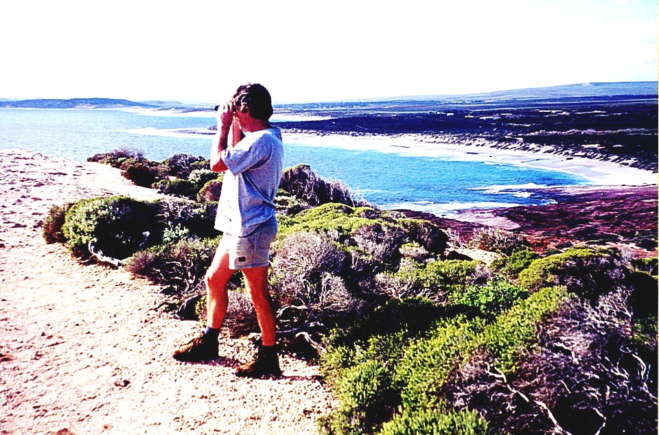 We went on down to the Boat Harbour briefly, on the way past Bower Street. We then took the road northwards and stopped as Adrian was getting dozy, to drive up to the Grigsons Lookout and from here we had 365 degrees of just bush, looking down to the sea, on one side and lots of sand dunes covered in vegetation mostly and salt lakes. We continued to Green Head where we stopped by Dynamite Bay, an almost circular bay, and did a little walk around there. Then we continued to Billy Goat Bay and like so many of the beaches here, it was absolutely thick with reddish seaweed, the stuff that dries out to look papery and it stinks. At Green Head we'd seen another skink, stumpy tailed lizard. At Leeman we stopped by the beach momentarily and we saw again largish holes, a couple of inches in diameter, where crabs, must live, but also some funny green stuff which we can only call sea cabbage till we find out what it is. We continued north past Coolimba, we were going to turn off to that, but it was a sand road, and we went for a short distance but it was all rutted, so didn't go any further. We continued north until we'd came to a couple of spots marked in our camping book and chose one which was just a flat area with a track leading down past, fisherman's huts near Knobby Head. We had a little walk out here and on the return passed the two people from Andover, who were at Canebrake Pool. Adrian had spoken to them, not me which is why I didn't recognise them - but he had trouble recognising them also. [they were on bikes with a hike tent]