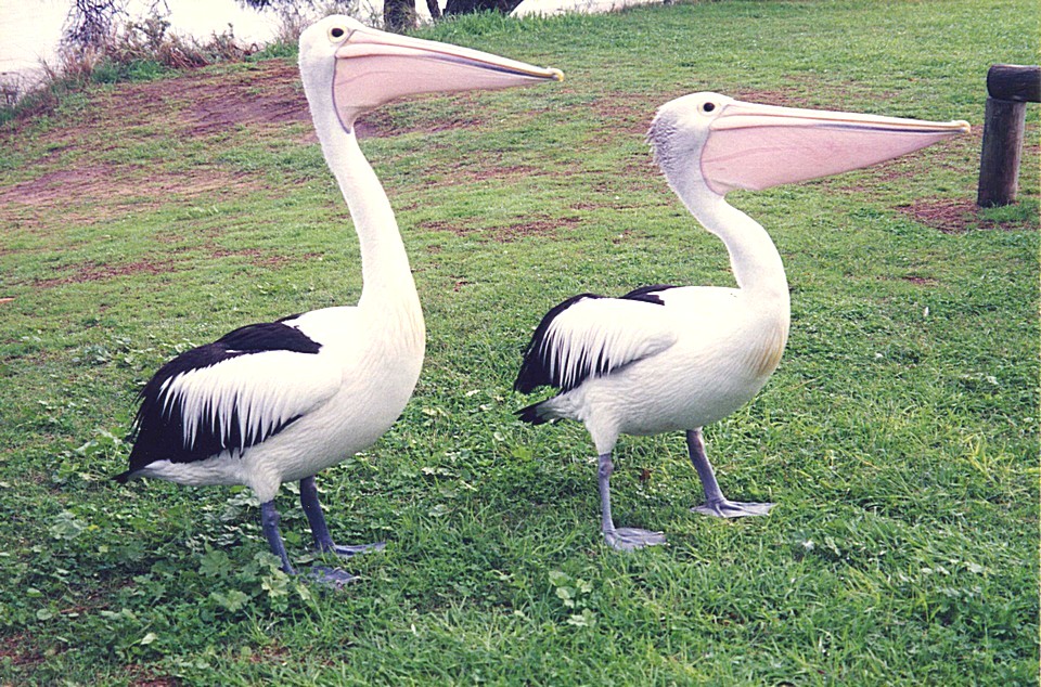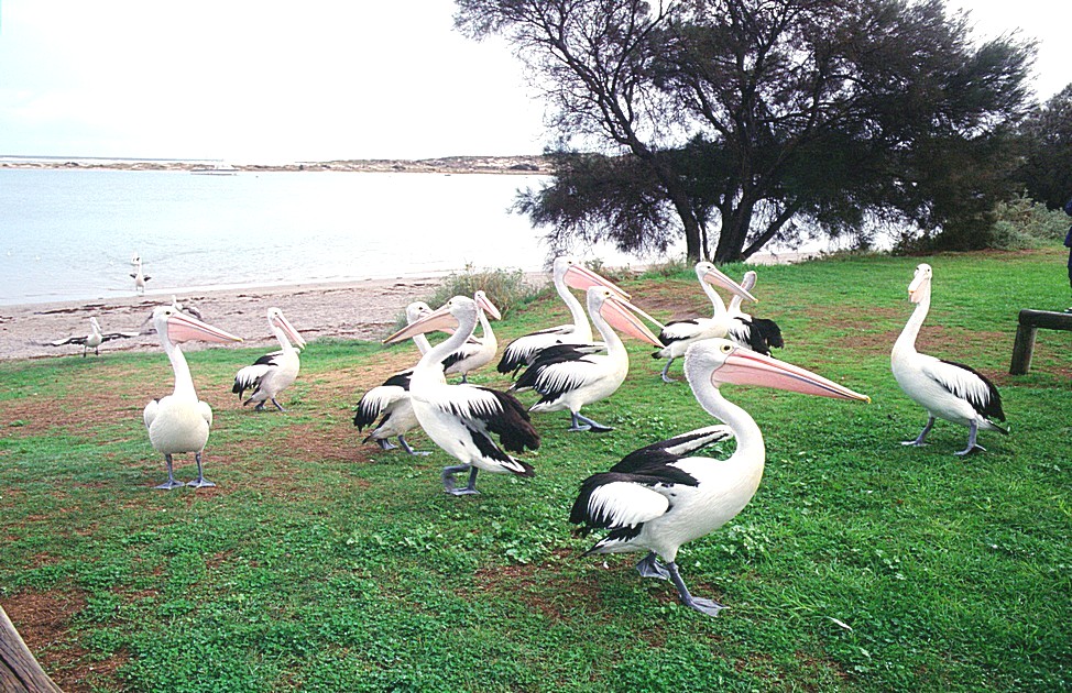 After a good night, we awoke to hear noisy galahs and someone leaving early and found the lady's statement about the rain not to be totally true. The morning had a mixed looking sky and we saw a rainbow. We were almost directly opposite the place where pelicans were fed at 8.45 and I had intended to watch this. But before then the sky became really black and it rained rather heavily, so we watched through binoculars, I was sitting still in my jarmies - we'd had breakfast, 8.45 passed, and people were out there waiting and by about nine o'clock it had just about stopped raining so we quickly donned some clothes and walked across the road, just in time to see the pelicans being fed. This was very enjoyable and there was a nice woman feeding them fish and explaining lots of facts about them and that was really quite fun. She said it never stays raining for long in Kalbarri! She did say that the river gorges we were hoping to go to that day might be closed if the weather was bad as it was a 22 kilometre plus on sand road to get there.