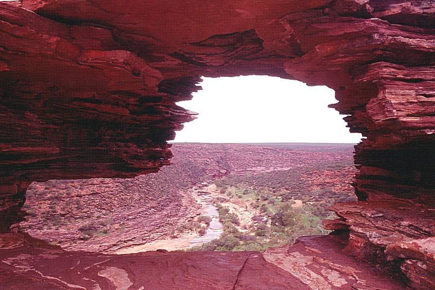 We went back to the Tourist Information to find that as far as she knew the roads were open. So we then started getting ourselves organised to leave about 10 o'clock. We stopped off at the baker's and bought some rolls and yummy cakes and went into a little supermarket and bought some milk and butter, but didn't find the bottle shop open. We then set off out of Kalbarri along the main road for about 35 km, and turned of on a track of 22 km before we took another track, stopping first at a lookout to the gorges and then continuing to Nature's Window carpark where we had our yummy cake and coffee before walking the half a kilometre to Nature's Window which is a bit of rock stuck out in a rather precarious position, viewing this very red gorge and layered sandstone. The colours just being the red of the rock and the green of the vegetation and unfortunately the grey of the sky. The sun did come out a bit, but we were absolutely plagued by millions of flies, and very off put by the lack of any directions. There was little sign saying 'Nature's Window' when you got near there, but not really in the right place and going to it was ‘at your own responsibility’, a very hairy situation I would have said.