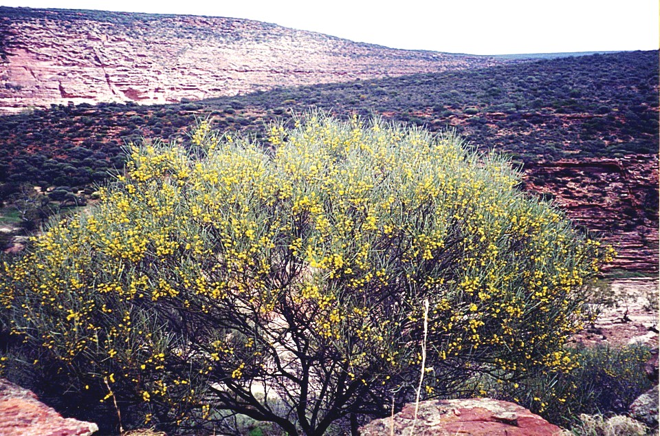 We returned to the van and left at 12.30. We drove back along this unmade up road to a place called the 'Z bend' some 12 kilometres south on a bumpy road, not too bad on the second section in fact, and there we went on a so called one kilometre return walk to the gorge. It was very impressive when we got there, steep sided, again nothing to stop you falling off, and nowhere to tell you where you ought to be walking and plagued by flies again. So hence we had our lunch on our return sitting inside the van, Adrian fixing the netting into the windows to make a through draught. We had seen a lot of this chain of yellow creeper which is growing through many of the plants, a bit like a little yellow lily of the valley flower, very pretty and also lots of banksias here which I of course always liked to see. We returned to the main road and went on 25 km and then turned off to a thing called the Hawks Head, where again we walked a few 100 metres to a precipice, nothing to stop you, and again lots of flies. We looked down and saw several kangaroos in the gorge below. We returned a few kilometres and then on a bit further to Ross Graham Lookout, and here the valley was much less steep. They did say you could walk down to the river but it was just down a sort of little riverbed very, very uneven underfoot, and it seemed to me you could rick your ankle very easily on it, so we didn't do that, we just looked out over the gorge. We now drove out of Kalbarri National Park and back to the main road north. We stopped on this road after 14.5 kilometres at Galena Bridge Rest Area. There were two places here one side was free camping and the other was a minimal fee site. We went to the free camping site, which was a large area near the Murchison River with lots of other people camping there, but we found a spot at the far end, had a short walk around and then spoke to a couple from Melbourne, Marge and Dez . I made a soup using the vast amount of vegetables which we had and adding bacon and a bit of the veal that we had bought.