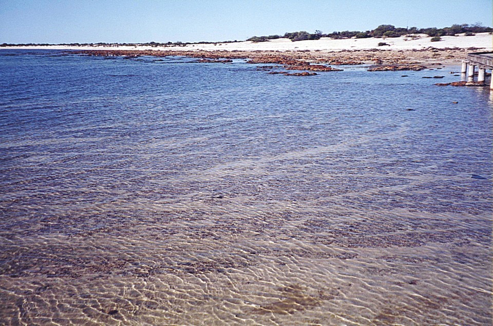 It had been a very cold night but we awoke to clear blue sky and a day which rapidly became warm. We had a minor disaster in finding a drip of water under the sink and when Adrian went to mend it, it turned into a flood, as he said, and he got a bit wet, so we had to sort the sink problem out. We found a little pathway behind us and thought we'd walk along it, but although it went for quite a distance, perhaps half a mile, it just ended at a derelict house, again the flies were an absolute nuisance. We returned to the van. There were three lots of wild flowers where we were, one a solanum type flower on a grey, fleshy leafed looking bush, one with tiny thin leaves and daisy type flowers and one a mauve fleshier, Adrian said orchid, but I don't think that because it was a flat petalled mauvy colour and they were there to add enjoyment and to makeup and in part for the flies. We left just after 10 o'clock and went to view the supposed minimal fee, campsite the other side of the river and found a vast area, nobody there at all, and the loo block mentioned in our book was flattened, well there was nothing there, so we presume that was the case. We then started heading north but the going was rather the same-ish all the way, not much at all on this long stretch, except a couple of homesteads and a couple of road houses, further along. We stopped some time after 11.00 at a large parking area where we had the last iced bun and saw the couple we met at Coronation Beach and last night. We continued on this uneventful road and at one point an emu ran across the road ahead of us. We stopped at the Overlander Roadhouse to get diesel, even more expensive. This and the Billabong Roadhouse were the only things we passed that morning. We turned off on the Shark Bay Road and then turned off to Hamelin Pool, the first bit of this road being surfaced, but then suddenly it deteriorated and went to unsurfaced and was very bad for a short distance. When we arrived at Hamelin Pool, we wondered what on earth we'd come to and what we were supposed to do. We were ready for lunch, so we had this sitting at some tables there and there was actually a breeze just where we were sitting. We then tried to find out about the place, there were stromatolites there like we'd seen at Lake Thetis, but this was in the sea or a long inlet of water. It turned out that there was a little museum bit telling us about the stromatolites and the Old Telegraph Station, which was there. We went into what was the Old Telegraph Station and were given a little talk on both things, a bit of video, and lots of things to look at on both accounts, very interesting. We then walked out across the beach and saw Shell Beach, the beach here is made of tiny shells and at one time these were quarried and used as building blocks.