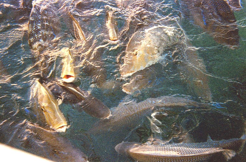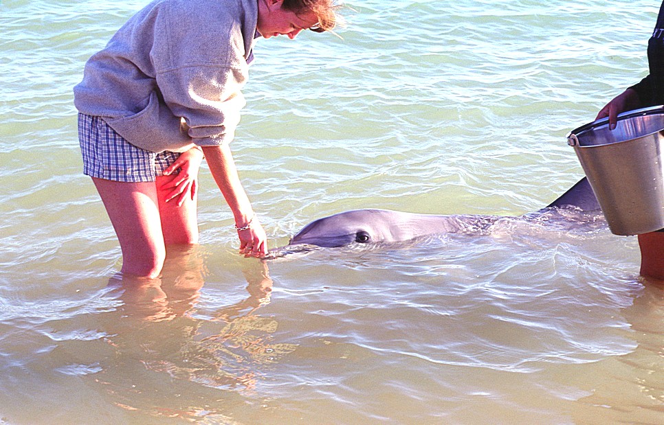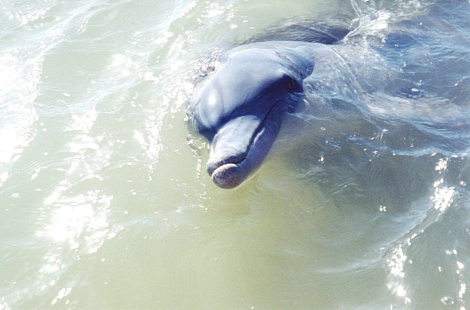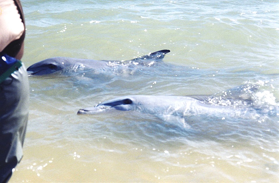 Then they went off by which time it was 8.45 and time to go back for breakfast. We had our breakfast and then got ourselves cleared up and put a bit of extra water into the tank. Drinking water, as we knew, was difficult to get from there, and most of the water on this site was bore water which wasn't for drinking and it left everything with a milky film on it, but we loaded a bit of drinking water into the tank. We then moved the van out to the car park and returned to the beach with the idea of having a swim. But when we passed the dolphin area we realised the dolphins were in again. There were two more this time, one ot them called Surprise and soon after we were there the Rangers fed them again and I was lucky enough to give one of them a fish, it was the one called Nicky.