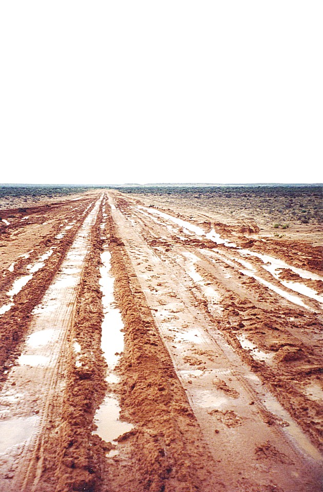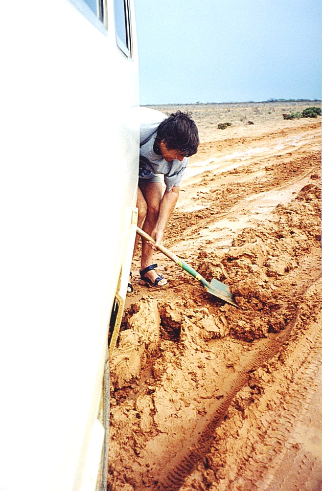 There was some rain and wind in the night a grey morning when we woke up. We had discovered that the jetty at Gladstone where we were, was for exporting sandalwood and wool. There's absolutely nothing there now, just the remains of the jetty. We decided not to stay another day and to go for it and hope we could get through the track, leaving at 9 o'clock, however disaster struck as we drove the 6.5 km back. We got through the first dodgy patch which didn't seem too bad but then we came to a very long stretch of thick, mud rutted road with lots of water. Adrian expertly got us along there until we were within shooting distance the far end of this stretch, when he lost control of the van and we got literally stuck in the mud. For about two hours or more, he tried various schemes of digging us out and we sometimes moved a little bit. During the time while he was trying to dig us out it rained very heavily once or twice but it brightened a bit but then we realised that we weren't going to get out on our own. So about 11.15 he set off to walk to the road which looked nearer than walking back to the campsite, in the hope of finding somebody who would be able to tow us out of the mess. After half an hour or so a white 4WD van approached and I expected Adrian to be in there - but he wasn't, only a gentleman and a lady who worked for the fisheries - they had a little badge on their jumpers. I explained the situation and they said they would go back and try and find Adrian. It turned out, he had just got to the end of the track after about a 2 km long walk and gone off to a farmstead on the other side of the road, when the van had arrived. Anyway they met up and came back together and after some time managed to hitch up our vehicle to theirs and started to try and pull us out. We then had a really heavy downpour which meant that the surface was really really slippery and we slithered and slid and we sometimes wondered if the van would make it even with them pulling us out. They towed us right out to the gate and they went on their way and decided not to go back down the track. [One of the many, many things I miss about not being with Rosie is, if we later ever got into any dodgy situation when we were travelling, with our motorhomes. I didn't have to explain how I felt I just said 'Gladstone Beach']