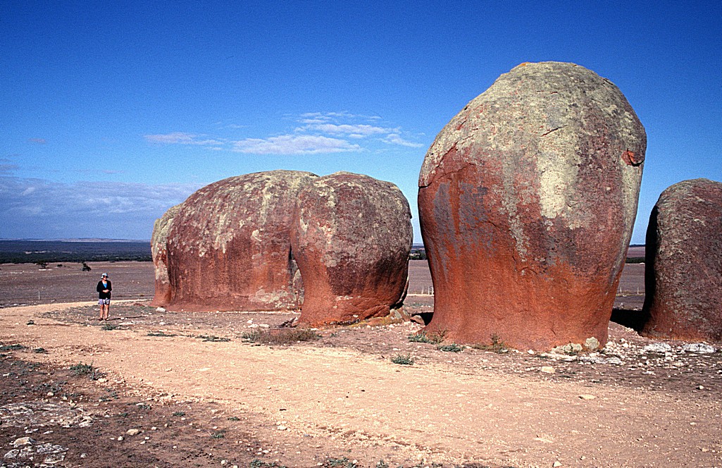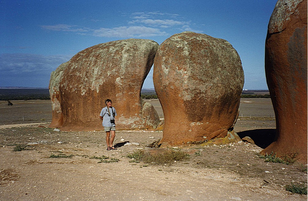 It was quite windy at that point but we had quite a walk around. We chose for lunch a place on the other side, on the inner harbour. We still had sea waves coming in, but it was much calmer, aquamarine blue, the sun had come out and we sat outside with the table and chairs and in this sheltered spot we were in, it was really hot and we enjoyed the sun for a long time. We were surprised how many people came and parked and went off fishing or trying to surf, the sea wasn't good for surfing, but of course this was bank holiday Monday - there were about 3 cars. We returned to the main road and after a few miles turned off on to an unmade up road looking for Murphy's Haystacks, but we didn't take the right road, the only map we had was so difficult to follow, and the distances of this unmade road were things like 48 kilometres, so we didn't want to get too lost. We did locate the Haystacks which were inselbergs of beautiful pink granite. In this rather barren landscape there were just these little blobbles, they reminded us of Remarkable Rocks on Kangaroo Island.