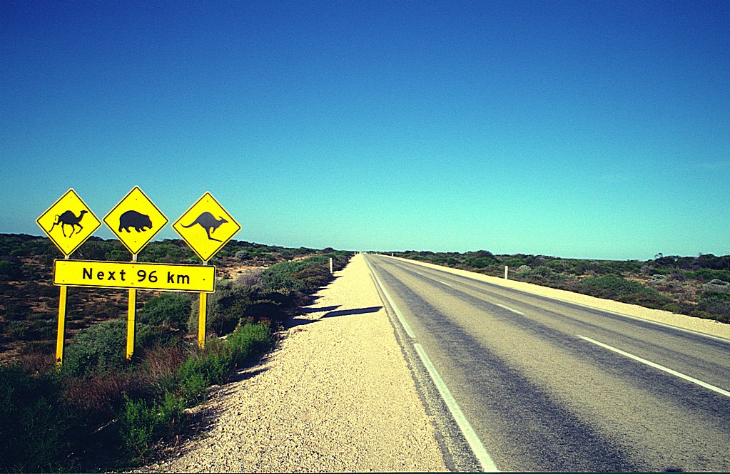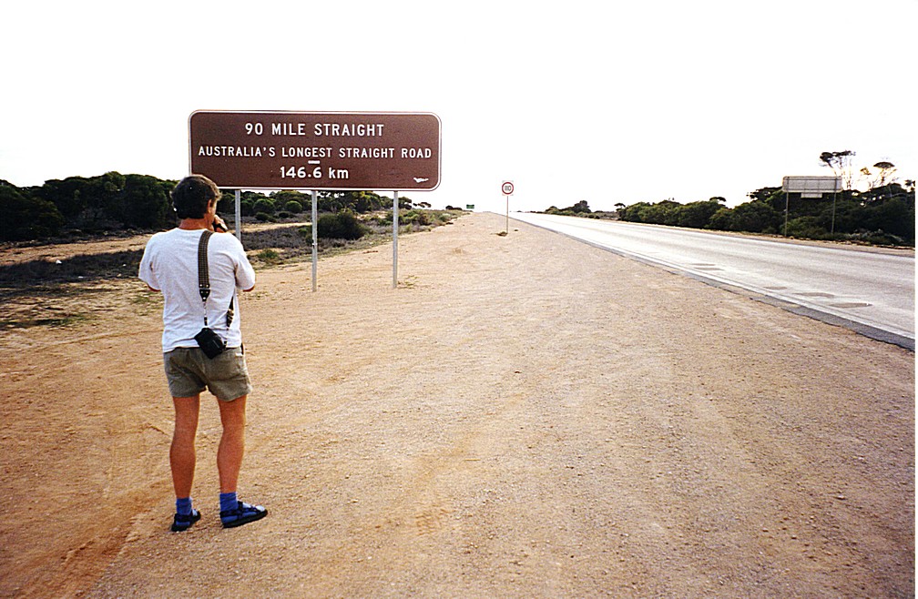 We passed the Roadhouse of Cocklebiddy and now the land became really Nullarbor looking, just flat barren and dried up grass with just a few odd trees, most of which were dead. We reached Caiguna and filled up with some very expensive diesel and soon after there was a sign saying 90 miles straight, Australia's longest straight road 146.6 kilometres.