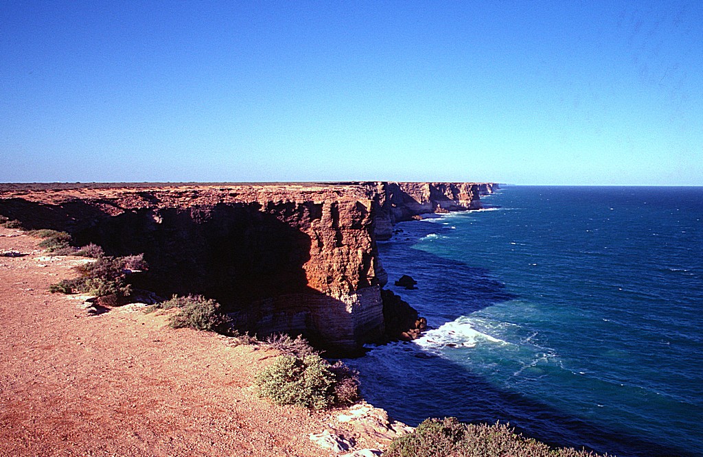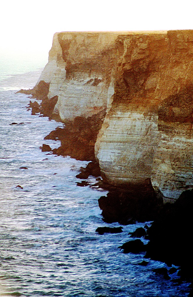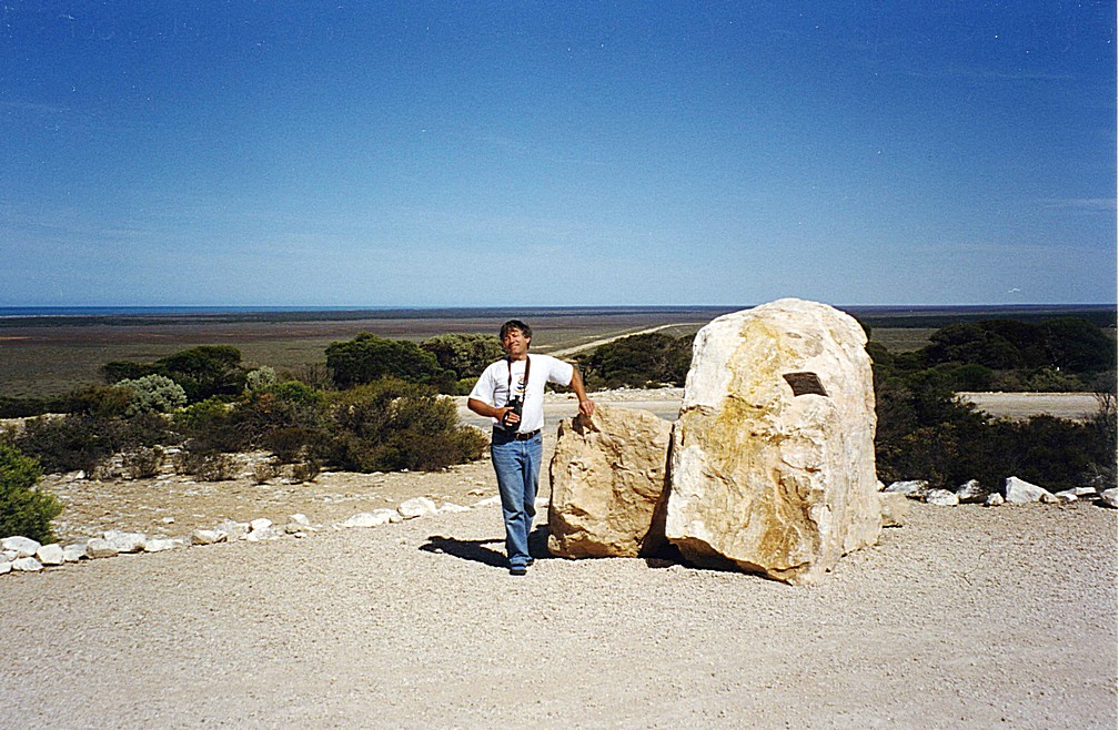 We stopped at the Nullarbor Road House where Adrian filled the van up with expensive diesel and I had a shower and hair wash costing $1, but Adrian didn't because apparently the men's was closed. It was just a very basic motel and an even more basic campsite and just a sandy yard in the middle of nothing. We turned off to the first look out over the sea, we drove a few hundred yards to this, on a made up track and when we got there, there was still a vehicle which built the road in 1976. We walked through low shrubs across to the cliff top, where although we knew what was going to happen, we came abruptly to the end of this cliff and there 300 feet below was the sea. You couldn't really see the sea at the base of the cliffs, as they sloped vaguely outwards and, along the top, it looked rather like a rock garden that had been planted along in front of us - I'm quite sure people hadn't planted things there. I was just glad I wasn't there with children as it was rather scary, windy and not a place to stay, but quite dramatic for all that with sheer cliffs, deep blue sea and pale blue sky. There we were, actually at the Nullarbor that we'd read so much about and of the pioneers doing this and arriving at the sea to find they were so high above it. At the second look out, we had a spectacular view up and down the shear cliffs of the Australian Bight and we took a photo and video here.